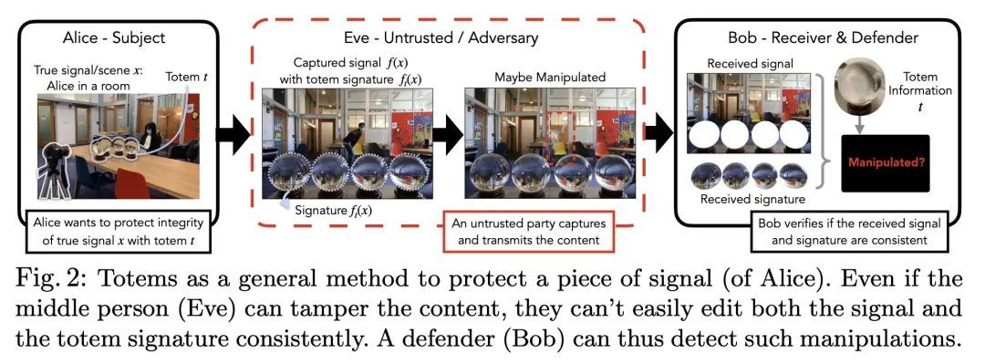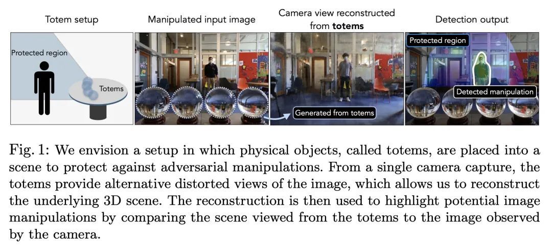 Totems:验证视觉完整性的物理折射体。本文提出一种新的图像取证方法:在场景中放置物理折射物体,称为Totem,以保护该场景的任何照片。图腾会弯曲和重定向光线,从而在一张图像中提供多个尽管是扭曲了的场景视图。防御者可以利用这些扭曲的Totem像素来检测图像是否被篡改过。该方法是通过估计Totem在场景中的位置并利用其已知的几何和材料属性来解读通过Totem的光线。为了验证一个受Totem保护的图像,检测从Totem视角重建的场景和从摄像机视角重建的场景外观之间的不一致。这种方法使对抗性操纵任务更加困难,因为对抗者必须在不知道Totem物理属性的情况下以几何上一致的方式修改Totem和图像像素。与之前基于学习的方法不同,该方法不需要对具体操作的数据集进行训练,而是利用场景和相机的物理属性来解决取证问题。