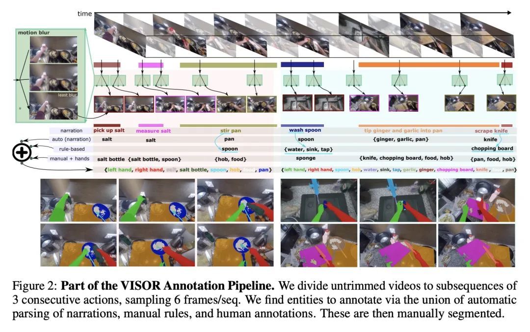 EPIC-KITCHENS VISOR基准:视频的分割与物体关系。本文提出VISOR,一种新的像素标注数据集和基准套件,用于在自我中心的视频中对手和活动物体进行分割。VISOR注释了来自EPIC-KITCHENS的视频,这带来了一系列新的挑战,是目前视频分割数据集所没有遇到的。需要确保像素级标注的短期和长期一致性,因为对象经历了转换性的互动,例如,一个洋葱被剥皮、切丁和煮熟,目标是获得皮、洋葱块、砧板、刀、锅以及行动的手的准确像素级标注。VISOR引入了一个标注管线,部分由AI驱动,以实现可扩展性和质量。总的来说,本文公开发布了257个物体类别的272个手动语义掩码,9.9M的插值密集掩码,67K的手-物体关系,覆盖了36小时的179个未修剪的视频。除标注以外,本文还介绍了视频目标分割、交互理解和长期推理方面的三个挑战。