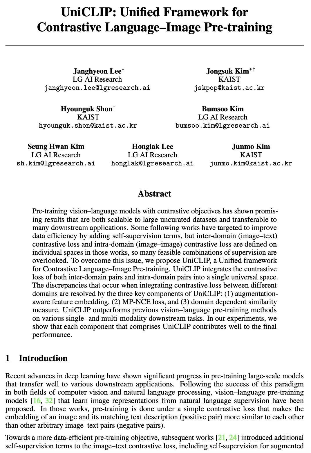 Pre-training vision–language models with contrastive objectives has shown promising results that are both scalable to large uncurated datasets and transferable to many downstream applications. Some following works have targeted to improve data efficiency by adding self-supervision terms, but inter-domain (image–text) contrastive loss and intra-domain (image–image) contrastive loss are defined on individual spaces in those works, so many feasible combinations of supervision are overlooked. To overcome this issue, we propose UniCLIP, a Unified framework for Contrastive Language–Image Pre-training. UniCLIP integrates the contrastive loss of both inter-domain pairs and intra-domain pairs into a single universal space. The discrepancies that occur when integrating contrastive loss between different domains are resolved by the three key components of UniCLIP: (1) augmentationaware feature embedding, (2) MP-NCE loss, and (3) domain dependent similarity measure. UniCLIP outperforms previous vision–language pre-training methods on various singleand multi-modality downstream tasks. In our experiments, we show that each component that comprises UniCLIP contributes well to the final performance.
