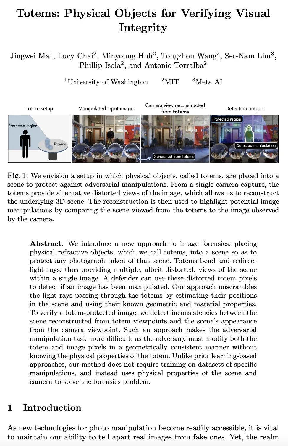 We introduce a new approach to image forensics: placing physical refractive objects, which we call totems, into a scene so as to protect any photograph taken of that scene. Totems bend and redirect light rays, thus providing multiple, albeit distorted, views of the scene within a single image. A defender can use these distorted totem pixels to detect if an image has been manipulated. Our approach unscrambles the light rays passing through the totems by estimating their positions in the scene and using their known geometric and material properties. To verify a totem-protected image, we detect inconsistencies between the scene reconstructed from totem viewpoints and the scene’s appearance from the camera viewpoint. Such an approach makes the adversarial manipulation task more difficult, as the adversary must modify both the totem and image pixels in a geometrically consistent manner without knowing the physical properties of the totem. Unlike prior learning-based approaches, our method does not require training on datasets of specific manipulations, and instead uses physical properties of the scene and camera to solve the forensics problem.