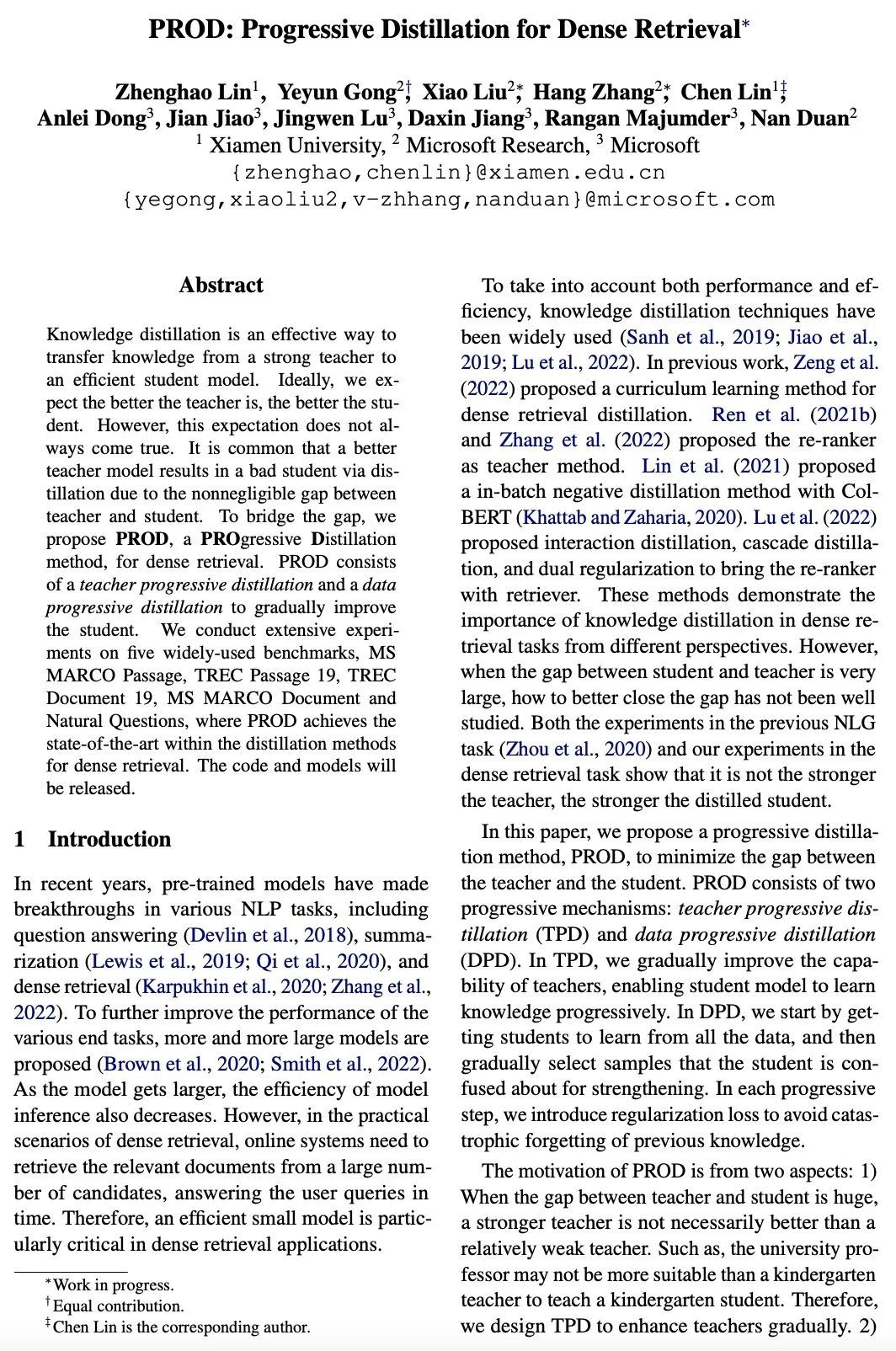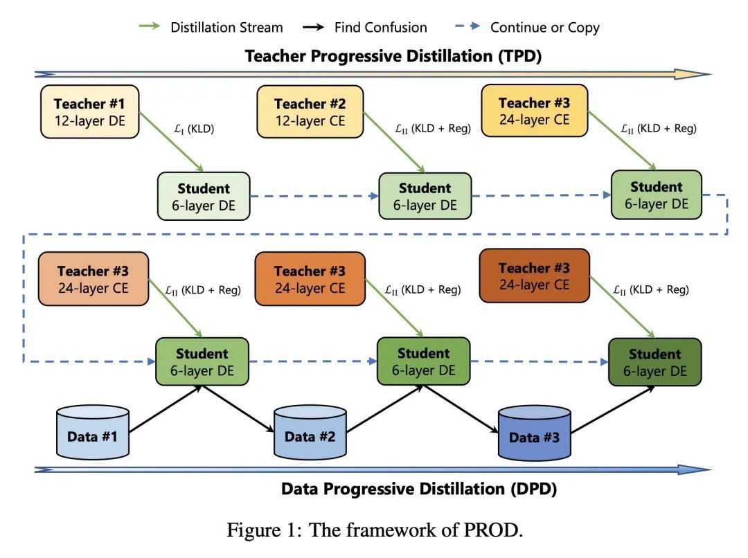 PROD:稠密检索的渐进式蒸馏。知识蒸馏是将知识从一个强大的教师模型转移到一个高效的学生模型的有效途径。理想情况下,期望老师越好,学生就越好。然而,这种期望并不总是能实现。由于教师和学生之间存在不可忽视的差距,一个更好的教师模型通过蒸馏导致一个糟糕的学生是很常见的。为了弥补这一差距,本文提出PROD,一种用于稠密检索的渐进蒸馏(PROgressive Distillation)方法。PROD包括一个教师渐进蒸馏法和一个数据渐进蒸馏法,以逐步提高学生的水平。在五个广泛使用的基准上进行了广泛的实验,包括MS MARCO Passage、TREC Passage 19、TREC Document 19、MS MARCO Document和Natural Questions,其中PROD实现了稠密检索的蒸馏方法中的最先进水平。