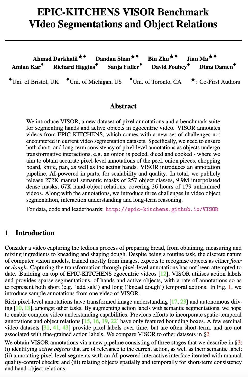 1、[CV] EPIC-KITCHENS VISOR Benchmark: VIdeo Segmentations and Object Relations