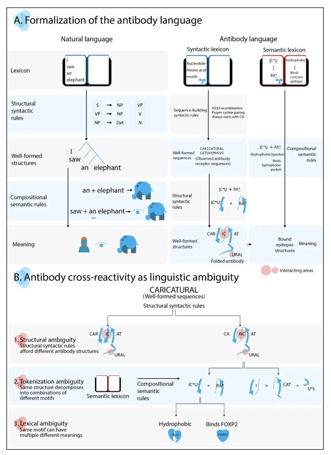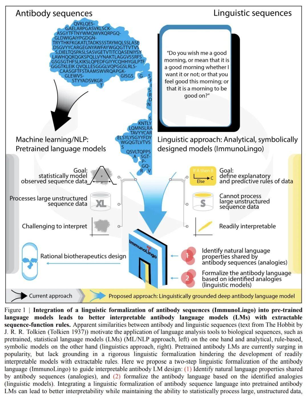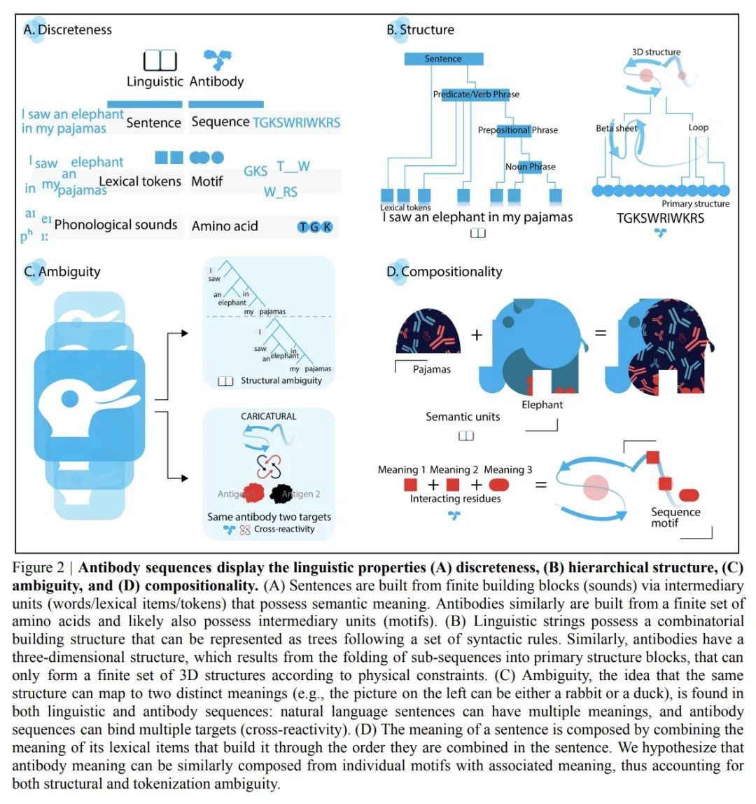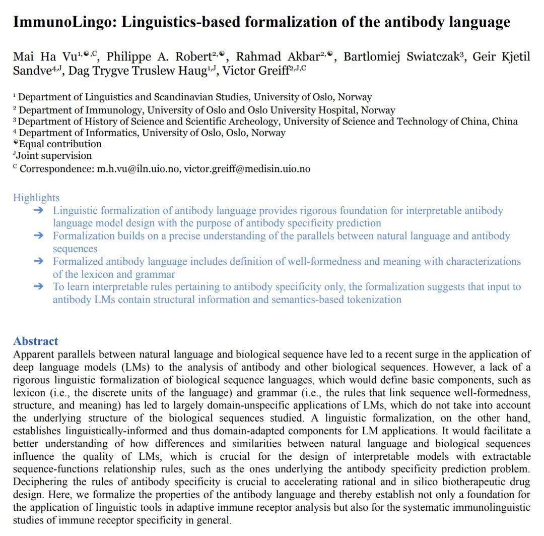 ImmunoLingo: 基于语言学的抗体语言形式化。自然语言和生物序列之间明显的相似性,导致了最近在抗体和其他生物序列分析中应用深度语言模型(LM)的热潮。然而,由于缺乏对生物序列语言的严格的语言学形式化,这将定义基本的组成部分,如词法(即语言的离散单位)和语法(即连接序列的完好性、结构和意义的规则),导致LM的应用在很大程度上是不特定领域的,没有考虑到所研究的生物序列的基本结构。另一方面,语言学的形式化建立了以语言学为基础的,从而与领域相适应的LM应用的组成部分。这将有助于更好地理解自然语言和生物序列之间的差异和相似性如何影响LM的质量,这对于设计具有可提取的序列-功能关系规则的可解释模型至关重要,例如抗体特异性预测问题的基础。破解抗体特异性的规则对于加速合理的、硅学的生物治疗药物设计至关重要。本文正式确定了抗体语言的属性,从而不仅为语言学工具在适应性免疫受体分析中的应用奠定了基础,而且也为免疫受体特异性的系统免疫语言学研究奠定了基础。