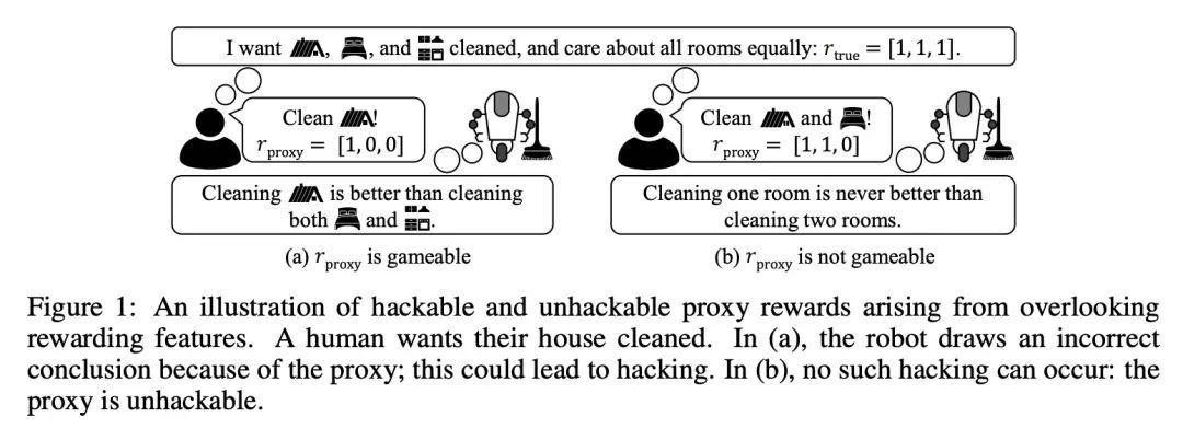 Reward Hacking的定义和刻画。本文提供了Reward Hacking的第一个正式定义,在这种现象中,优化一个不完美的智能体奖励函数R~会导致根据真实奖励函数R的不良表现。如果增加预期的智能体回报永远不会减少预期的真实回报,那么智能体就是不可hack的。直觉上,通过从奖励函数中排除一些条款(使其 "更窄")或忽略大致相等的结果之间的细微区别,有可能创建一个不可hack的智能体,但本文表明通常不是这种情况。一个关键的见解是,奖励的线性(在状态-行动访问计数中)使得不可hack性成为一个非常强大的条件。特别是,对于所有随机策略的集合,只有当其中一个是常数时,两个奖励函数才可能是不可hack的。因此,本文把注意力转向确定性策略和有限的随机策略集,在这些策略集中,非三态的不可hack对总是存在的,并为简化的存在建立必要和充分的条件,这是不可hack性的一个重要特例。本文结果揭示了使用奖励函数来指定窄任务和使人工智能系统与人工价值观保持一致之间的矛盾。
