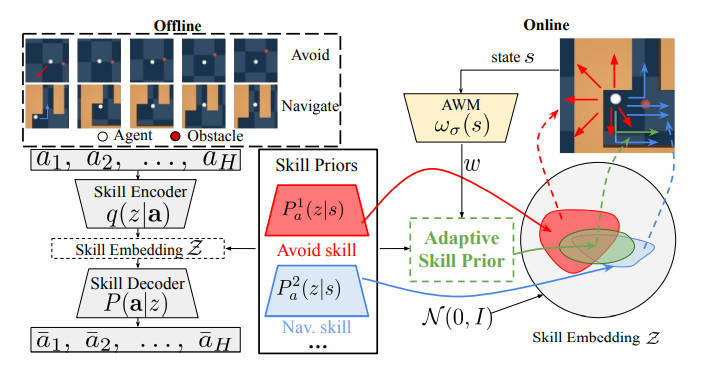 【推荐理由】本文提出了 ASPiRe(RL 的自适应技能先验),一种利用先前经验加速强化学习的新方法。与从庞大且多样化的数据集中学习单一技能先验的现有方法不同,本文的框架从一组专门的数据集中学习不同区分技能先验(即行为先验)的库,并学习如何将它们结合起来解决新任务。 该概念允许算法获得一组更可重用于下游任务的专业技能先验;然而,它也带来了额外的挑战,即如何有效地结合这些非结构化的技能先验集,为新任务形成新的先验知识。具体来说,它要求智能体不仅要确定要使用哪种技能先验,还要确定如何将它们组合(顺序或同时)以形成新的先验。为了实现这一目标,ASPiRe 包含自适应权重模块 (AWM),该模块学习推断不同技能先验之间的自适应权重分配,并使用它们通过加权 Kullback-Leibler 散度指导下游任务的策略学习。