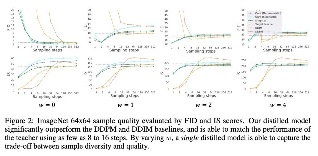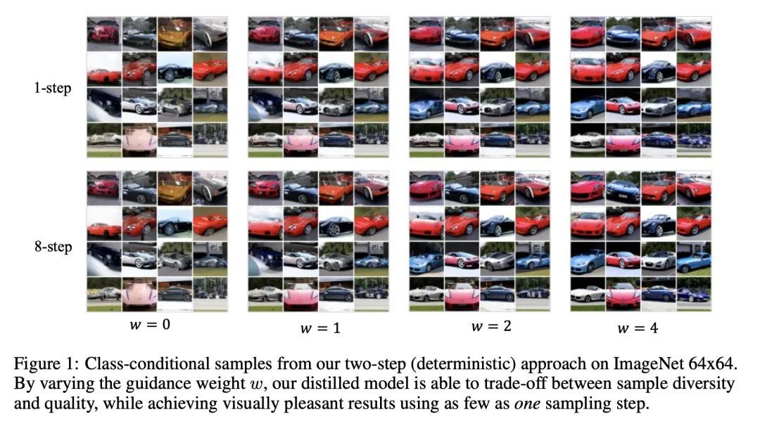 引导扩散模型蒸馏研究。最近,无分类的引导扩散模型被证明在高分辨率图像生成方面非常有效,其被广泛用于大规模扩散框架,包括DALL-E 2、GLIDE和Imagen。然而,无分类指导的扩散模型的一个缺点是,其在推理时的计算成本很高,因为需要评估两个扩散模型,一个类别条件模型和一个无条件模型,需要数百次。为了解决该问题,本文提出一种将无分类指导的扩散模型蒸馏成快速采样模型的方法:给定一个预训练好的无分类指导模型,首先学习一个单一模型来匹配合并的条件模型和无条件模型的输出,然后逐步将这个模型蒸馏成一个需要更少采样步骤的扩散模型。在ImageNet 64x64和CIFAR-10上,该方法能在视觉上生成与原始模型相当的图像,只需4个采样步骤,就能获得与原始模型相当的FID/IS分数,而采样速度却高达256倍。