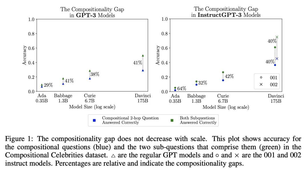 衡量和缩小语言模型的组合性差距。本文研究了语言模型执行组合推理任务的能力,其中整体解决方案取决于对子问题答案的正确组合。本文衡量模型能够正确回答所有子问题但不能产生整体解决方案的频率,这个比率称为组合性差距。通过询问多跳问题来评估该比率,这些问题的答案需要由多个不太可能在预训练中一起观察到的事实组成。在GPT-3系列模型中,随着模型规模的增加,发现单跳问题的回答性能比多跳性能提高得更快,因此组合性差距并没有减少。这个令人惊讶的结果表明,虽然更强大的模型能够记忆和回忆更多的事实性知识,但它们在进行这种组合性推理的能力方面没有显示出相应的改进。本文展示了引导性提示(如思维链)是如何通过显性推理而不是隐性推理来缩小组成性差距的。本文提出一种新方法,即自问(self-ask),进一步改善了思维链。在该方法中,模型在回答最初的问题之前明确地问自己(然后回答)后续问题。自问的结构化提示使得可以很容易地插入一个搜索引擎来回答后续问题,从而进一步提高准确性。