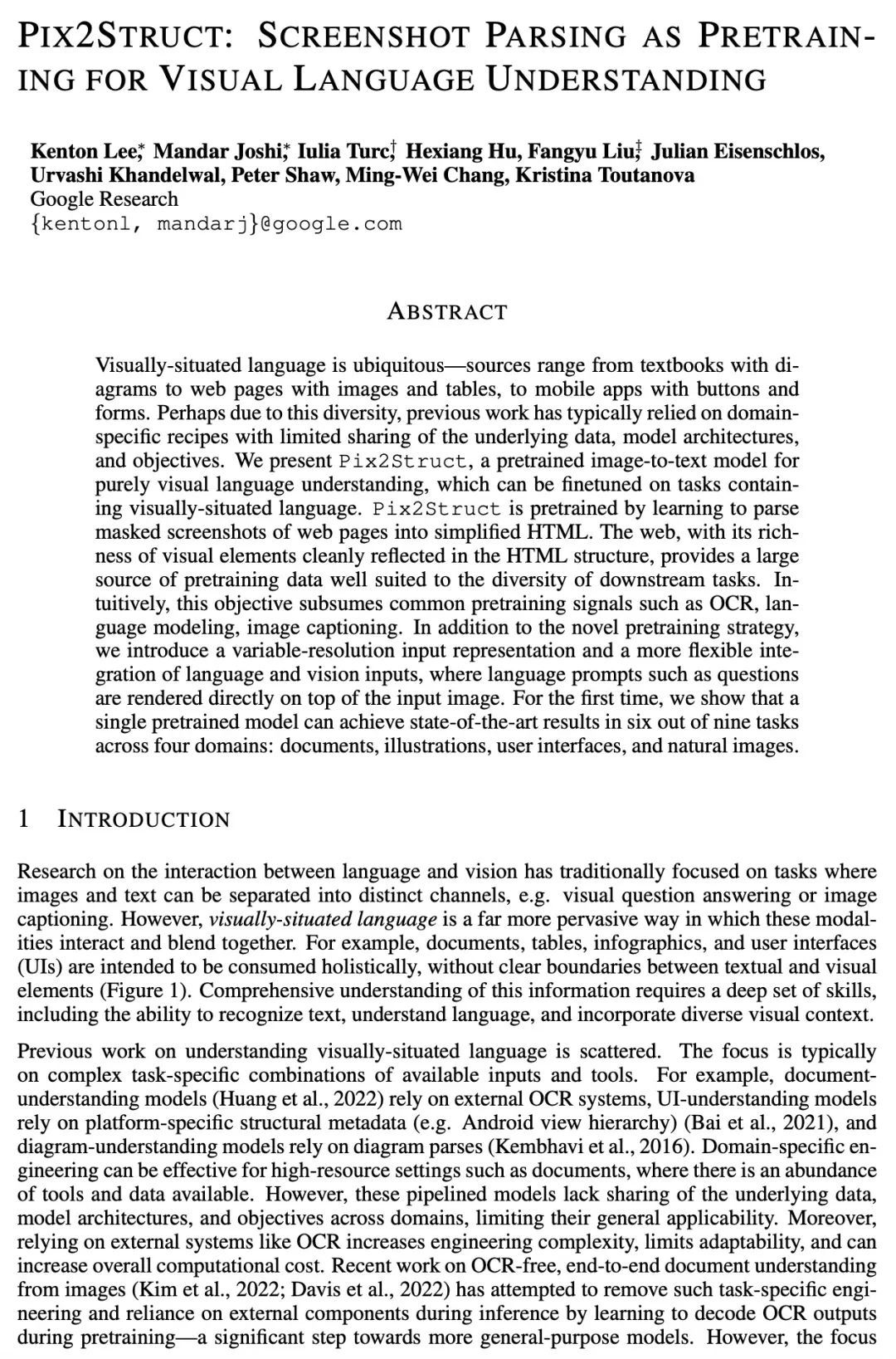 1、[CL] Pix2Struct: Screenshot Parsing as Pretraining for Visual Language Understanding