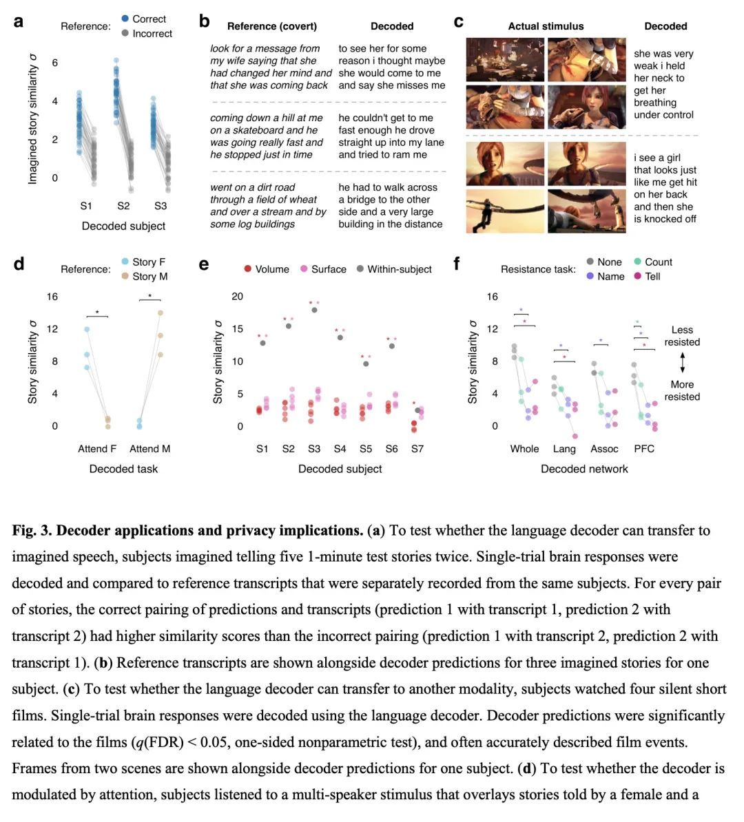 基于非侵入性脑记录的连续语言语义重建。从非侵入性记录中解码连续语言的脑机接口将有许多科学和实际应用。然而,目前重建连续语言的解码器用的是手术植入电极的侵入性记录,而使用非侵入性记录的解码器只能从一小部分字母、单词或短语中识别刺激反应。本文提出一种非侵入性解码器,能从用功能磁共振成像(fMRI)记录的语义的皮质表征中重建连续的自然语言。考虑到新的脑记录,该解码器产生了可理解的单词序列,恢复了感知到的语音、想象中的语音,甚至是无声视频的意义,证明了单一语言解码器可用于一系列语义任务。为了研究语言是如何在整个大脑中表示的,本文在不同的皮质网络上测试了解码器,发现自然语言可以从每个半球的多个皮质网络中分别进行解码。由于脑机接口应尊重心理隐私,本文测试了成功解码是否需要主体合作,并发现主体合作在训练和应用解码器时都是需要的。本文研究表明,连续的语言可以从非侵入性的大脑记录中解码,从而使未来的多用途脑机接口成为可能。