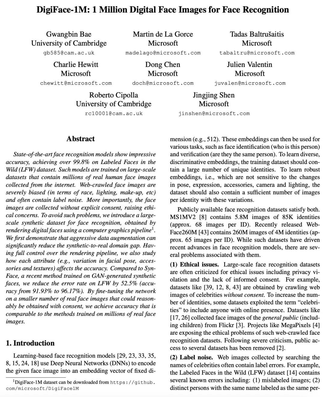 [CV] DigiFace-1M: 1 Million Digital Face Images for Face Recognition