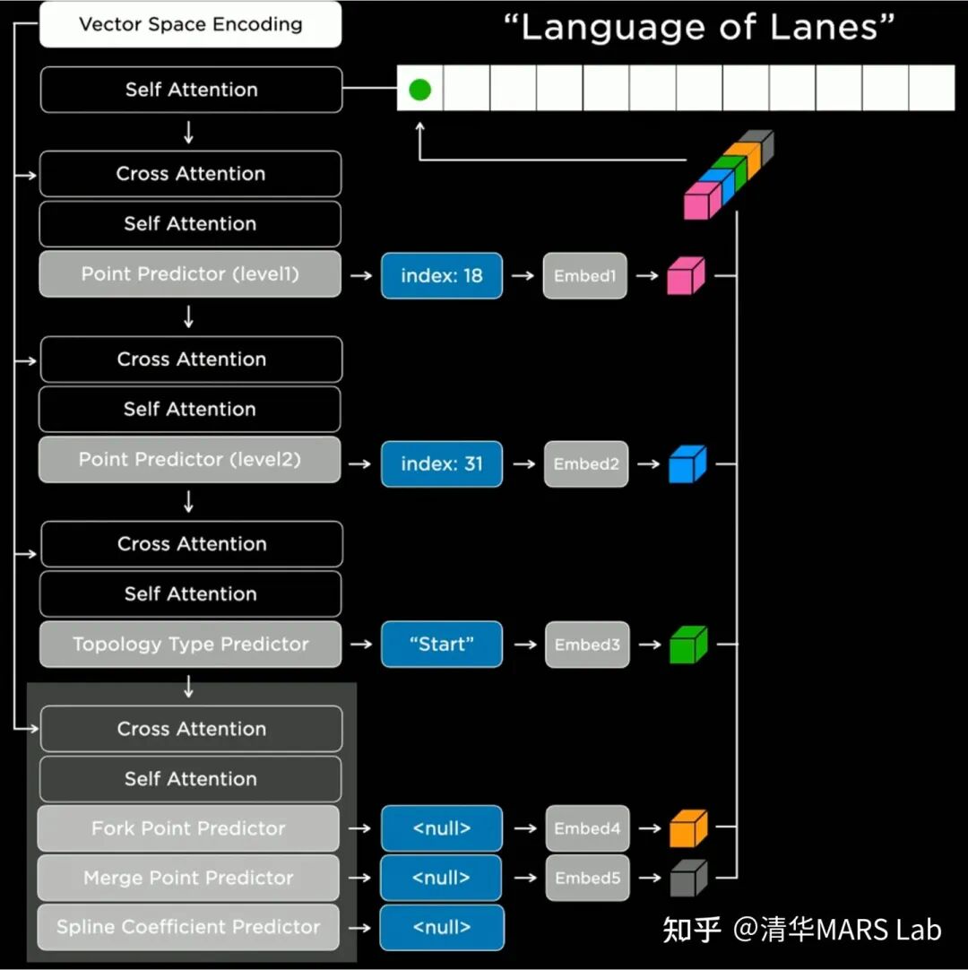 特斯拉参考了自然语言模型中的Transformer decoder,以序列的方式自回归地输出结果。具体实现上来说,我们首先要选取一个生成顺序(如从左到右,从上到下),对空间进行离散化(tokenization)。然后我们就可以用Lanes Network进行一系列离散token的预测。如图所示,网络会先预测一个节点的粗略位置的(index:18),精确位置(index:31),然后预测该节点的语义("Start",即车道线的起点),最后预测连接特性,如分叉/并道/曲率参数等。网络会以这样自回归的方式将所有的车道线节点进行生成。