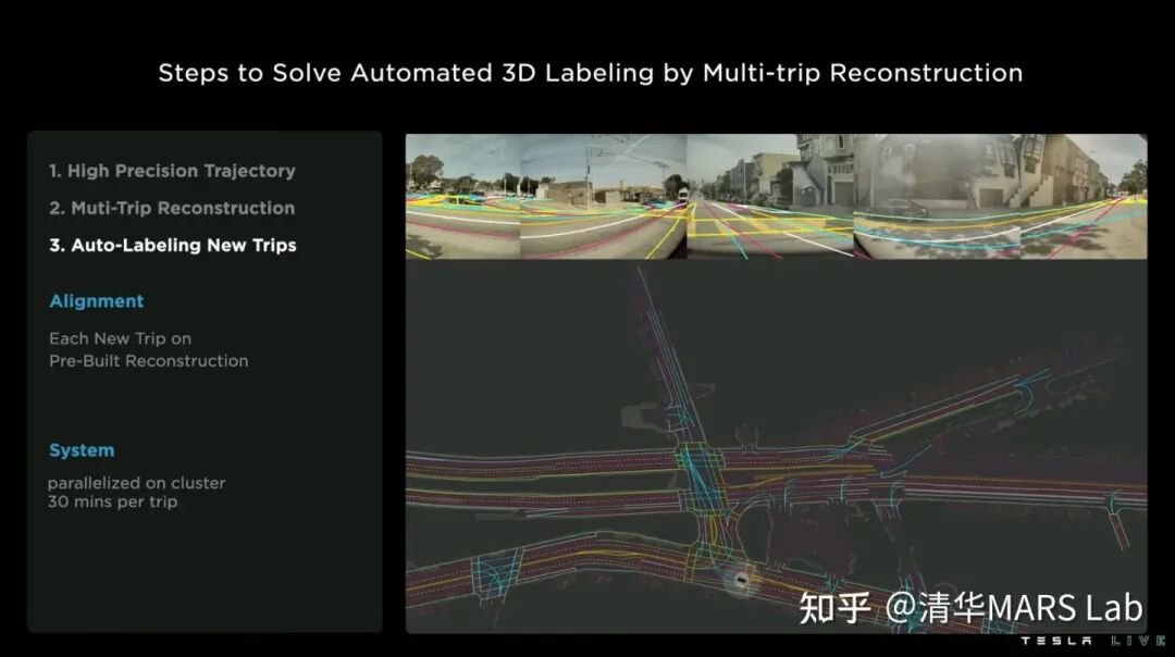 自动标注也是特斯拉在去年AI Day就讲解过的一种技术,今年的自动标注着重讲解了Lanes Network的自动标注。 特斯拉的车每天就能产生500,000条驾驶旅程(trip),利用好这些驾驶数据能够更好地帮助进行车道线的预测。 特斯拉的自动车道线标注有三个步骤: