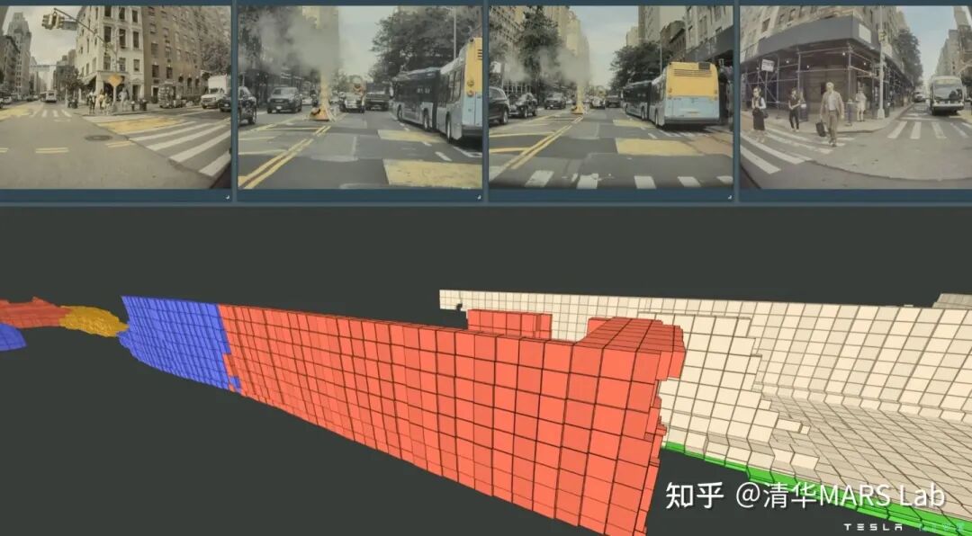 特斯拉用下图的具体例子来展现Occupancy Network的强大。不同于3D的框,occupancy这种表征对物体没有过多的几何假设,因此可以建模任意形状的物体和任意形式的物体运动。图中展示了一个两节的公交车正在启动的场景,蓝色表示运动的体素,红色表示静止的体素,Occupancy Network精确地估计出了公交车的第一节已经开始运动,而第二节还处于静止状态。