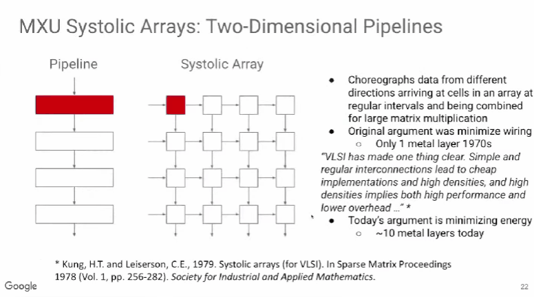 TPU v1使用了脉动阵列(systolic array),这一概念早在40年前就被提出,做法是以固定的时间间隔使数据从不同方向流入阵列中的处理单元(cell),最后将数据累积,以完成大型矩阵乘法运算。由于70年代的芯片只有一个金属层,不能很好地实现互连,所以Kung和Leiserson提出“脉动阵列“以减少布线,简化连接。