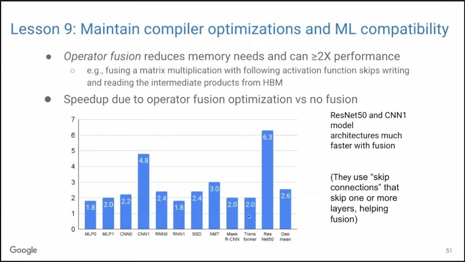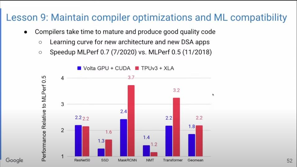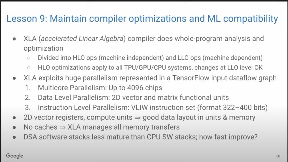 为什么保持后向ML兼容性如此困难?因为浮点加法不符合结合律,所以运算顺序可能会影响运算结果。而TPU的任务就是让所有机器对编译器而言都没有区别,以便可以在重组代码的同时获得相同的高质量结果,以实现后向ML兼容性。