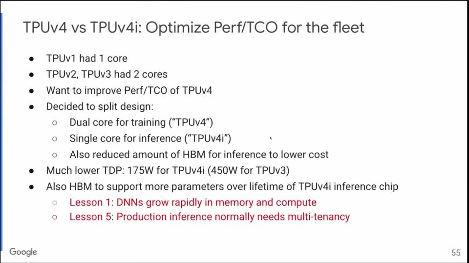 之前提到,TPU v1有一个Tensor Core,v2和v3有两个。到了v4时,基于对总体拥有成本的考虑,Google决定分开设计:用于训练的TPU v4有两个Tensor Core,用于推理的TPU v4i只有一个。这样就大大提升了性能和总体拥有成本之间的比率。