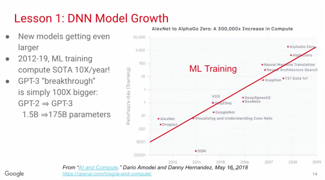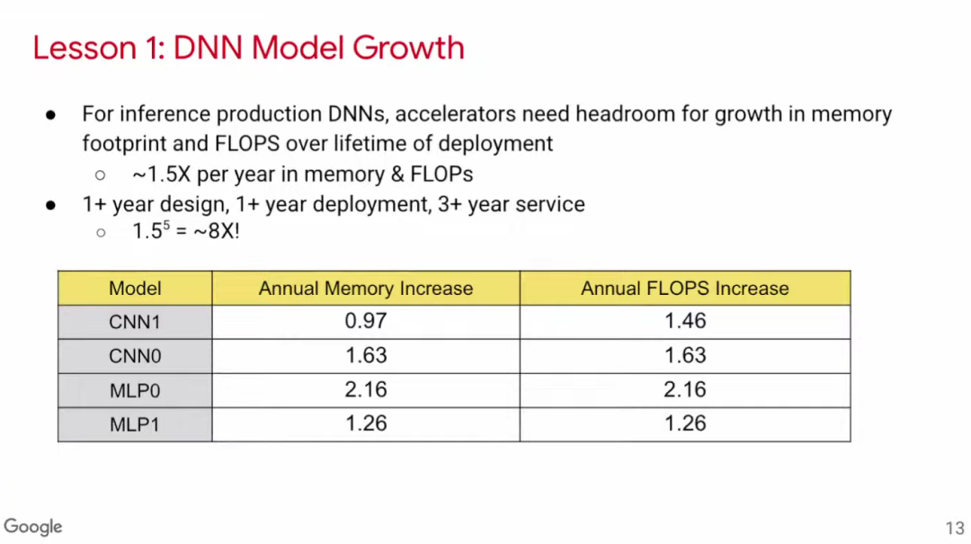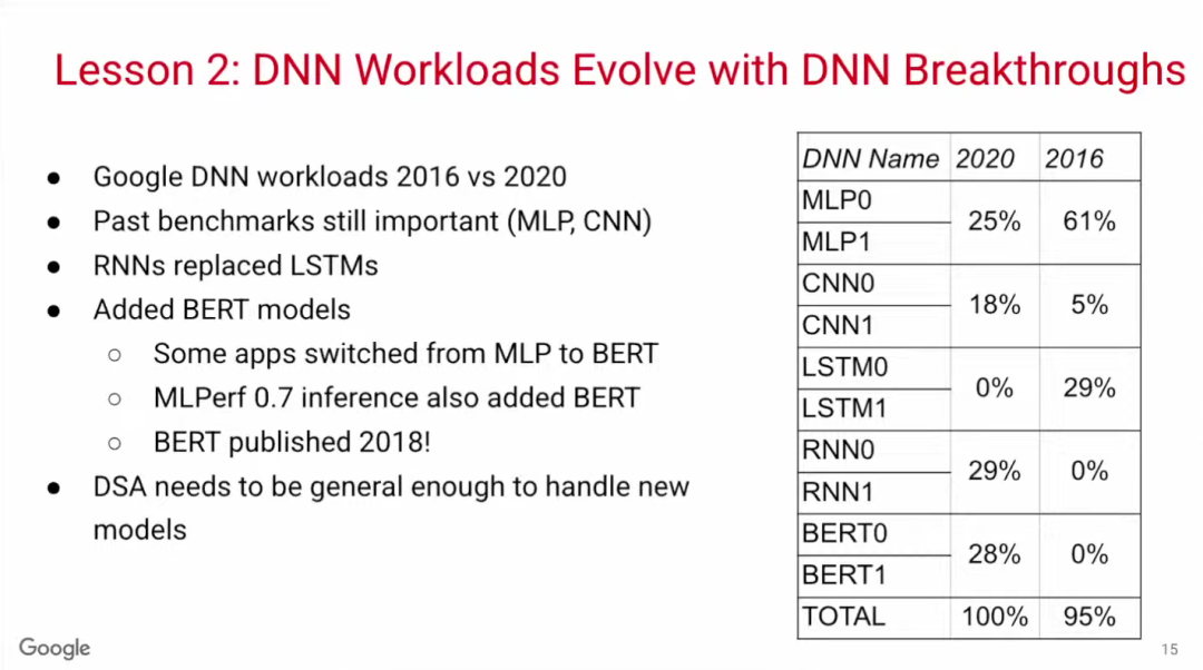 深度学习是一个日新月异的领域。2016年,MLP(多层感知器)模型仍是主流,但到2020年,CNN、RNN和BERT等不同模型百花齐放。BERT是一种全新的Transformer模型,诞生于2018年,短短两年后,四分之一以上的Google内部应用都在使用BERT模型,可见深度学习发展变化之快。因此,ML计算架构需要能够支持多种模型。