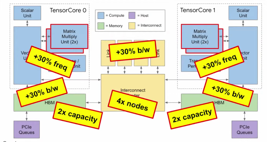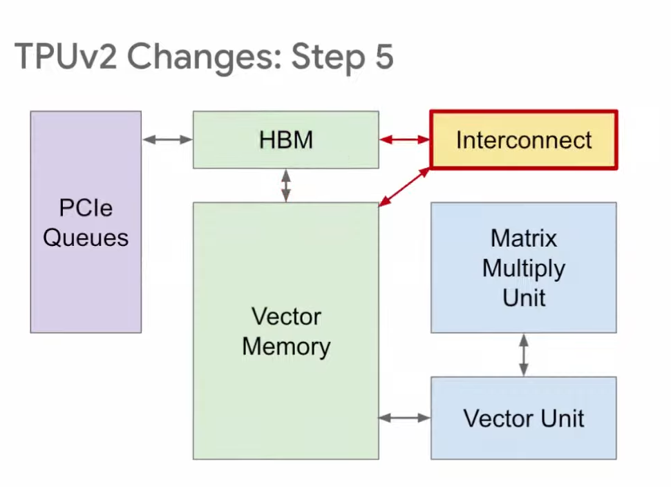 第五步,我们在HBM和向量存储区之间增加互连(Interconnect),用于TPU之间的连接,组成我们之前提到的Pod超级计算机。以上就是从TPU v1到TPU v2的改进。
