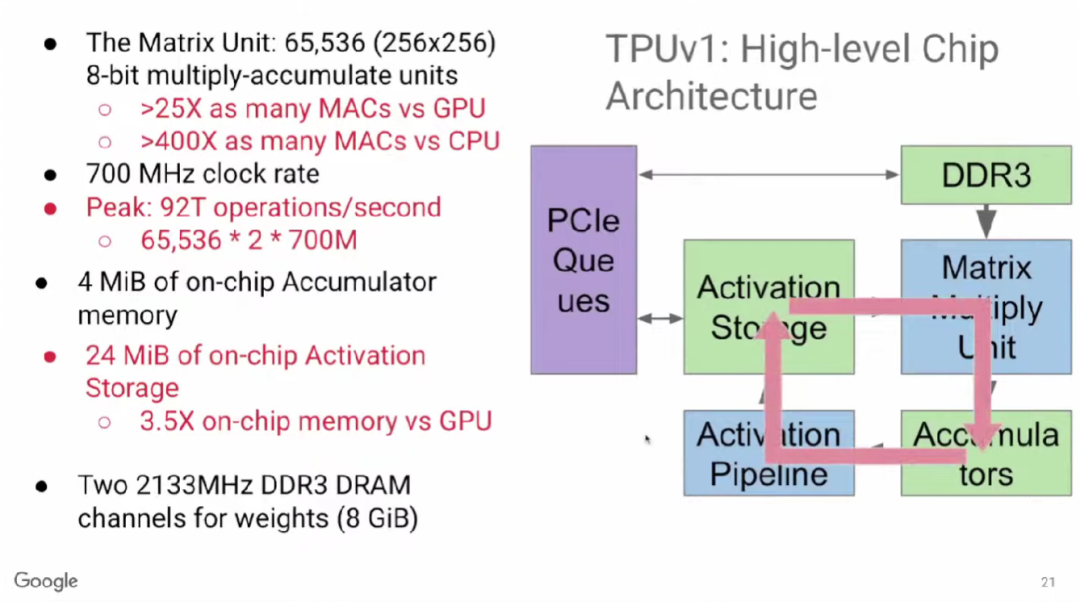 上图右侧展示了运算时的主要工作循环。65,000多个乘法器组成矩阵乘法单元(Matrix Multiply Unit)。计算时,首先启动累加器(Accumulator),然后通过激活函数管道(Activation Pipeline)进行非线性函数运算。累加器和激活函数输出存储(Activation Storage)是两个主要功能单元之间的缓冲区。内存(DDR3)向矩阵乘法单元输入参数;最后,计算结果通过PCIe队列返回服务器。