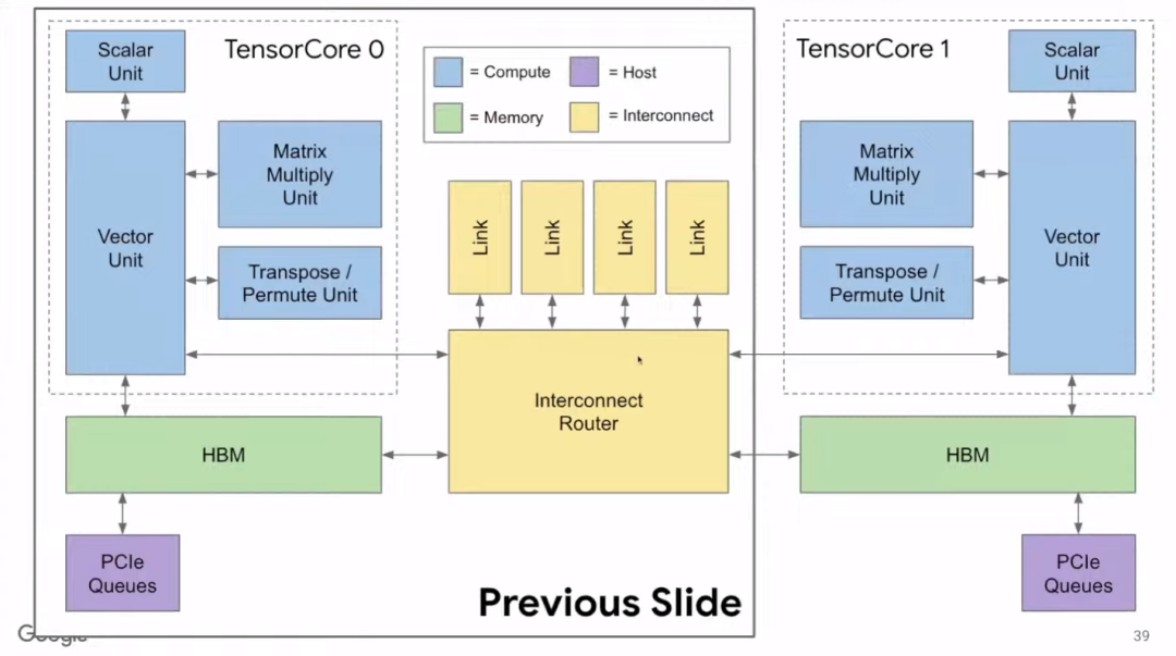上图虚线框内展示了单个Tensor Core运算单元。TPU v2中有两个互连的Tensor Core。