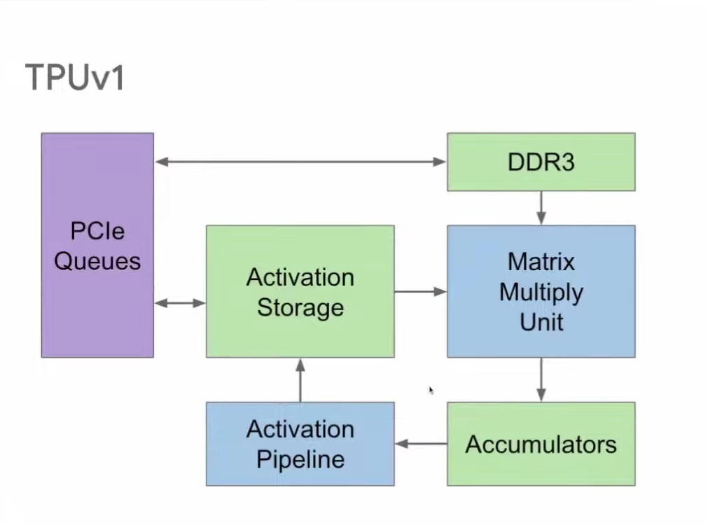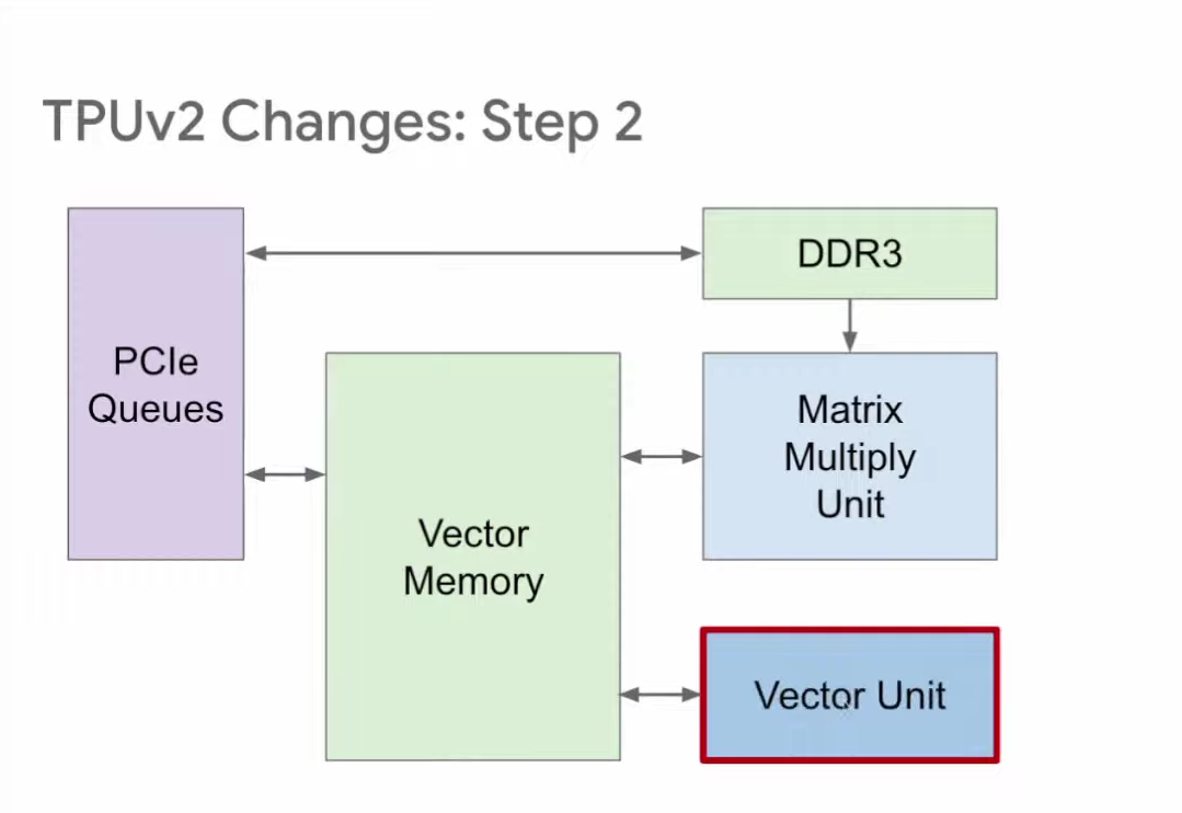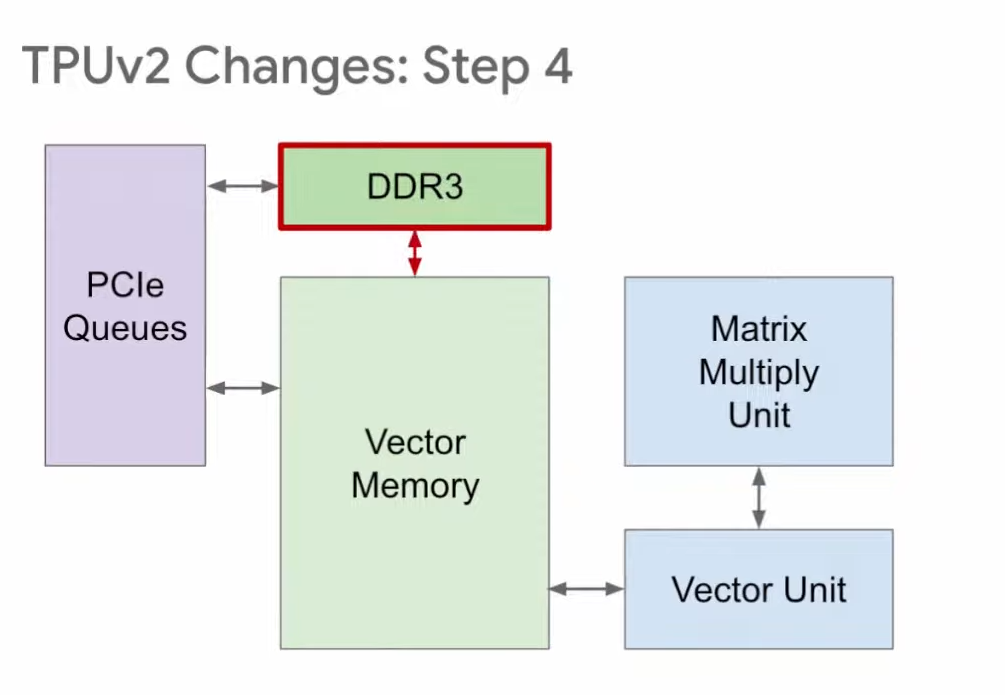 第四步,TPU v1使用DDR3内存,因为它针对的是推理,只需使用已有的权重,不需要生成权重。针对训练的TPU v2则不一样,训练时既要读取权重,也要写入权重,所以在v2中,我们将原本的DDR3改为与向量存储区相连,这样就既能向其读取数据,又能向其写入数据。