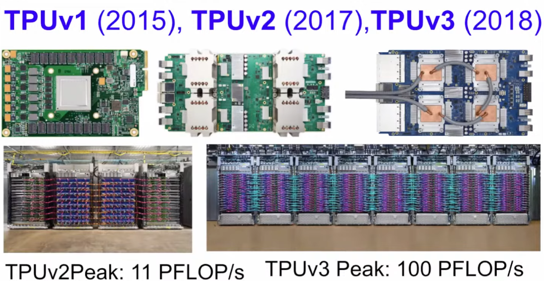 上图左上角即为TPU v1的主板。中间是v2,v2的散热方式是风冷,所以图中可见高高突起的风冷散热器。右上角是v3,v3的运行温度太高,所以只能采用液冷。左下角是TPU v2组成的Pod超级计算机,共有256张TPU,峰值性能为11 PFLOP/s;右侧的TPU v3 Pod有1024张TPU,峰值性能可达100 PFLOP/s(1 PFLOP/s即每秒1015次浮点运算)。