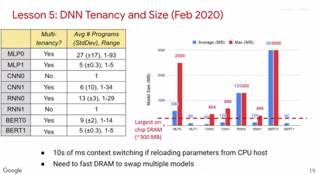 如上图所示,我们收集了8个模型的基准数据,其中6个模型涉及多租户。右方的柱状图展示了模型大小(以MB计算)。红色虚线表示单块芯片的最大SRAM,可见不少模型需要的内存远大于此,这意味着需要有存取速度极快的DRAM。部分芯片的设计思路是利用SRAM解决所有任务,但在多租户应用场景下,我们认为这很难办到。