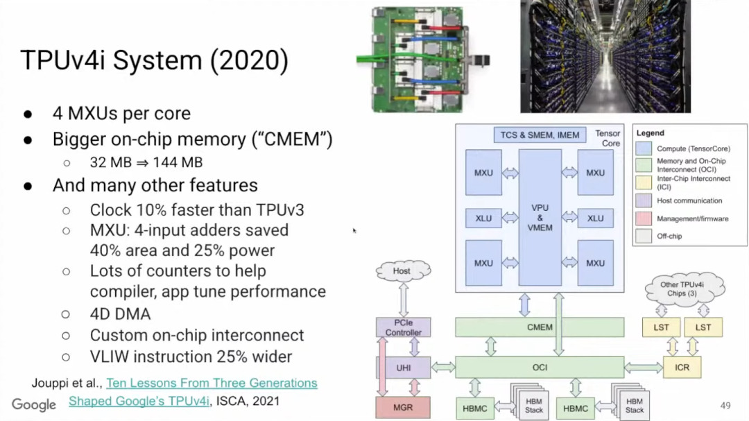 如果想了解TPU v4i,可以阅读论文《Ten Lessons From Three Generations Shaped Google’s TPUv4i》。TPU v4i中,单个Tensor Core有4个矩阵乘法单元,是v3的两倍,且v4i的片上内存更大。此外,TPU v4i的时钟频率加快了10%,矩阵乘法单元中使用四位加法器(4-input adder),可以大幅节省芯片面积和功耗。