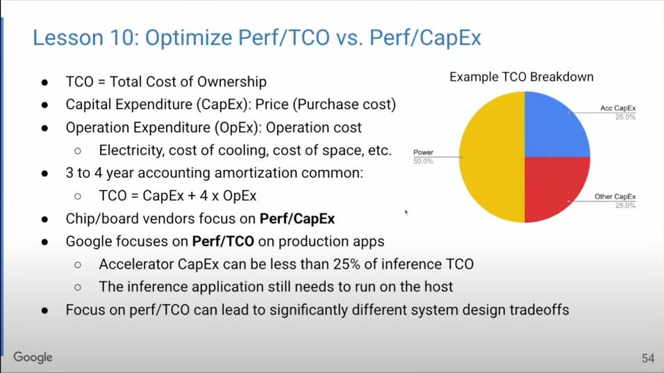 在将研究成果应用到实际生产时,我们优化的目标是什么?Google构建硬件是为了用在自己的数据中心,所以我们所要控制的成本是指总体拥有成本(TCO),包括资本成本(采购成本)和运行成本(电力、冷却、空间成本)。资金成本是一次性的,而运行成本需要持续支出3~4年。
