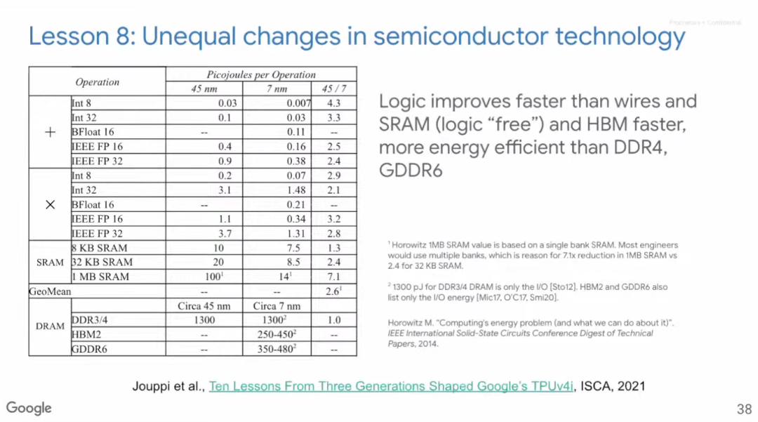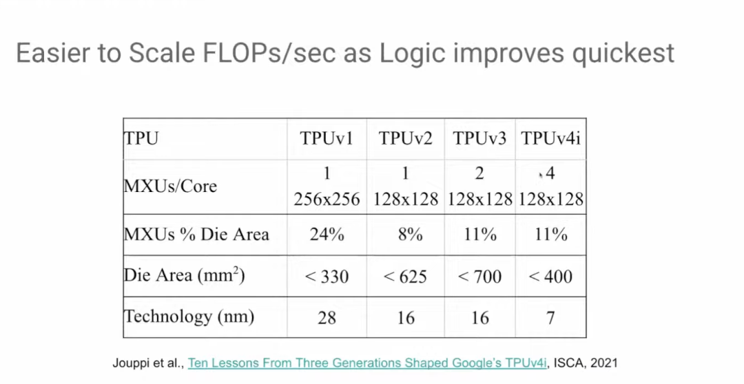 从TPU v3到TPU v4i,矩阵乘法单元的数量再次翻倍,但芯片面积却没有扩大。如前所述,计算逻辑的发展速度是最快的。