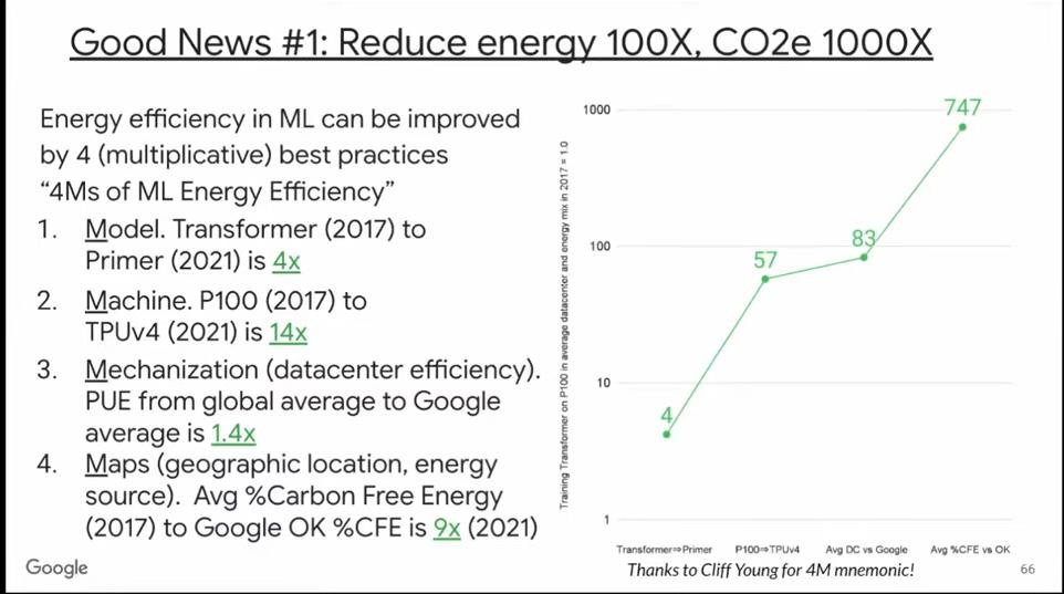 综合上述四个因素,我们可将机器学习的能耗降低80倍,碳排放量降低700倍。这非常了不起。