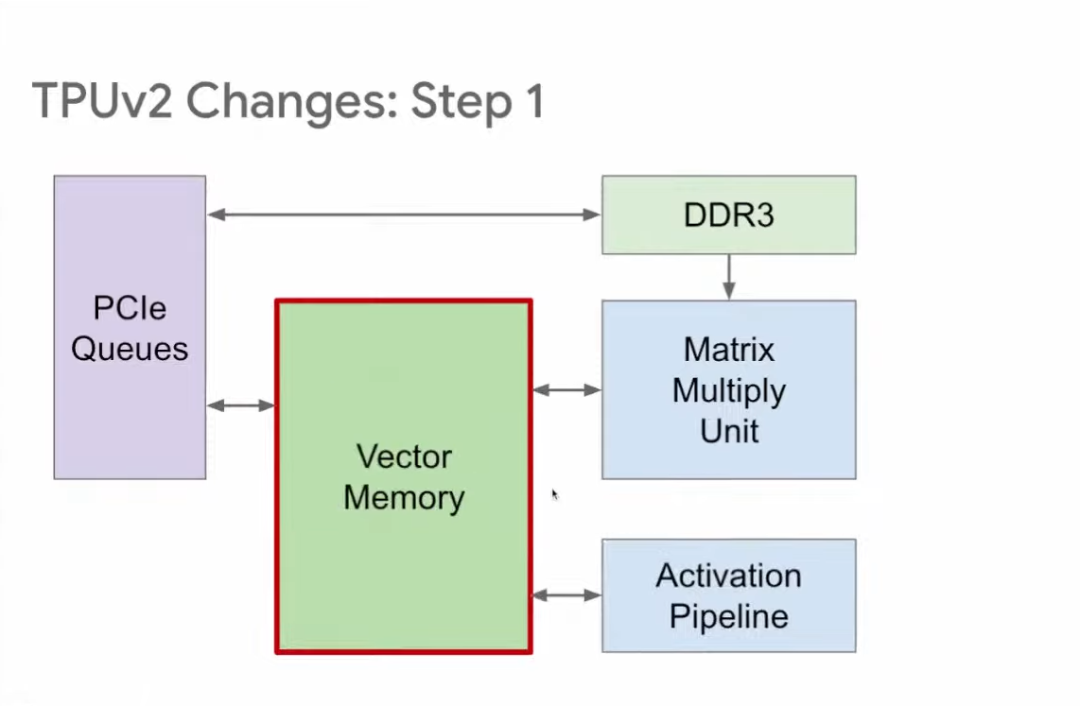 与TPU v1相比,TPU v2的改进分为5步。第一步,TPU v1有两个存储区域:Accumulator和Activation Storage,前者负责储存矩阵相乘结果,后者负责储存激活函数输出。