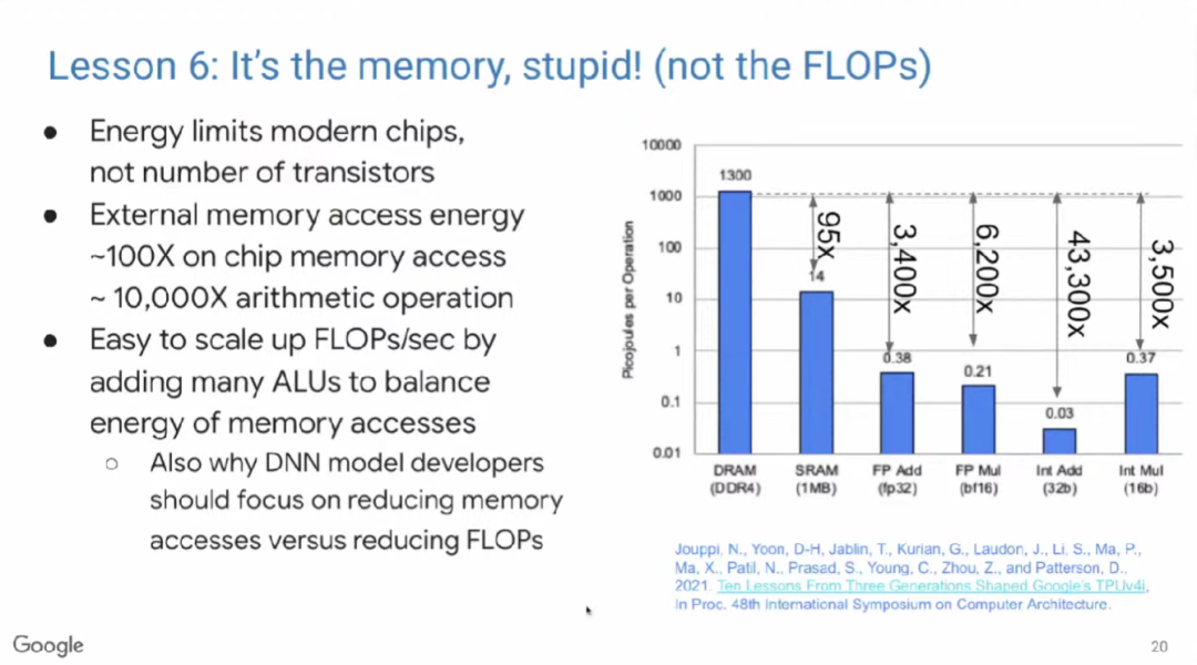 现代微处理器最大的瓶颈是能耗,而不是芯片集成度。Yahoo!创始人Mark Horowitz在十多年前就发现,访问片外DRAM的能耗是访问片上DRAM的100倍,是算术运算的5000~10,000倍。因此,我们希望可以通过增加浮点运算单元(FPU)来分摊内存访问开销。基于Mark Horowitz的数据,芯片上的FPU数量被设置为10,000个左右。ML模型开发人员常常试图通过减少浮点运算数来优化模型,但其实减少内存访问数才是更有效的办法。
