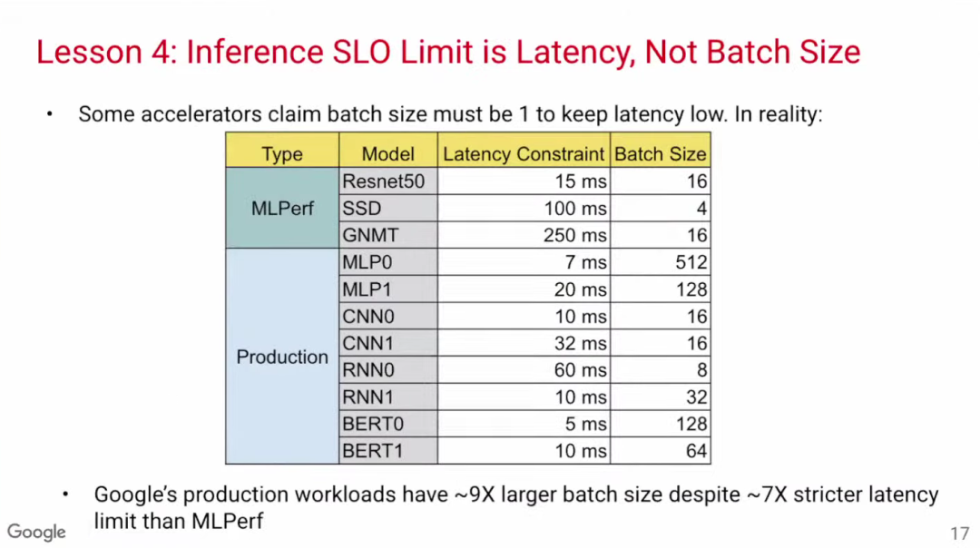 一些关于模型推理优化的论文把重点放在数据批次规模(batch size)上,认为要把batch size设置为1才能使延迟降到最低。然而,通过MLPerf基准数据可见,Google的生产模型在batch size相当大的情况下也能实现低延迟,这可能是因为这些模型是基于TPU开发,因此更加高效。