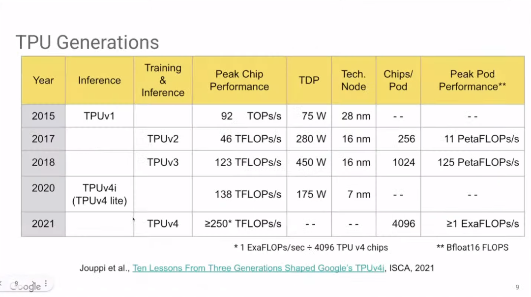 上图展示了TPU的发展历史。其中,Google尚未公布TPU v4i(TPU v4 lite)的相关细节。去年Google宣布TPU v4i已在云服务上可用,也发表了一篇关于TPU v4i的论文(https://www.gwern.net/docs/ai/scaling/hardware/2021-jouppi.pdf)。
