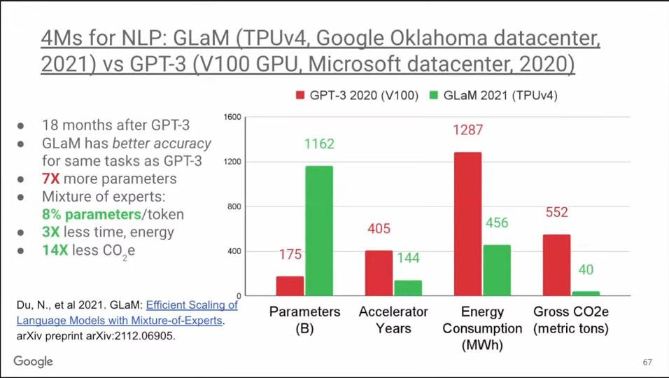 最后,与GPT-3不同的是,GlaM在俄克拉荷马州使用清洁能源进行训练,因此累计下来,其碳排放量降低了14倍。所以GlaM的例子表明,相比V100 GPU,使用TPU v4既减少了碳排放量,而且计算质量更好。