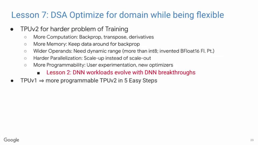 作为一种针对特定领域的架构(DSA),TPU的难点在于既要进行针对性的优化,同时还须保持一定的灵活性。Google在推出用于推理的TPU v1之后,决定攻克更难的问题——训练。