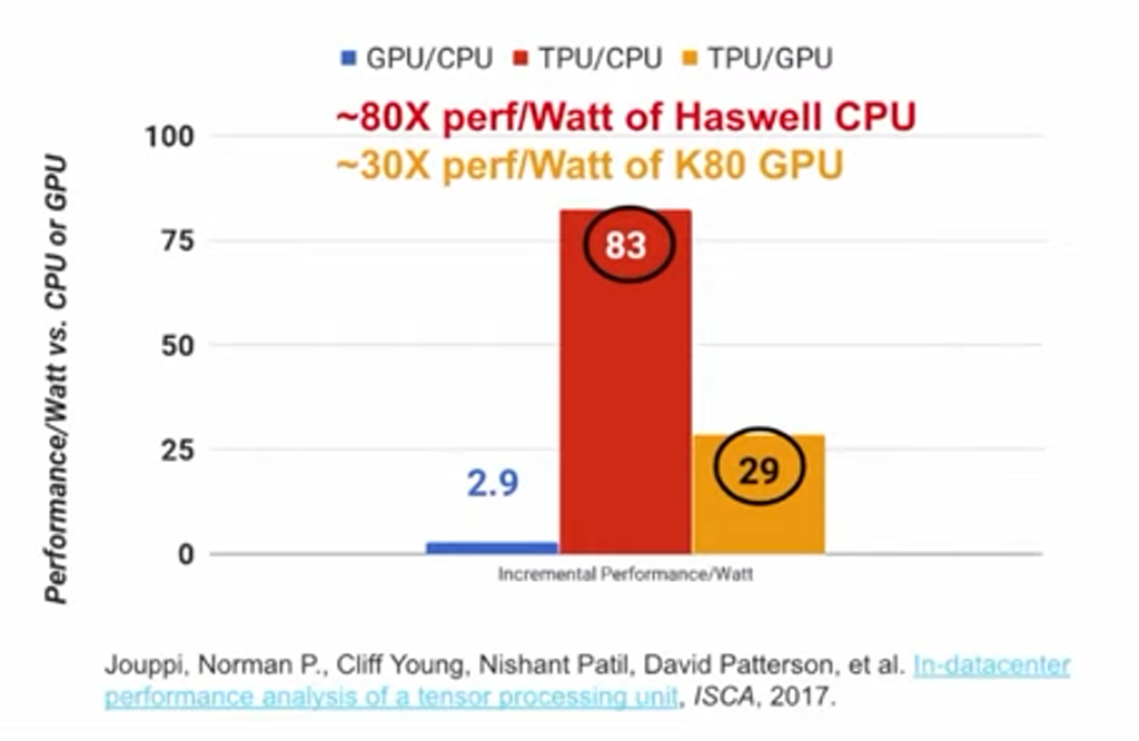 于是,Google在2014年开始研发TPU,项目进展神速,仅15个月后TPU就可在Google数据中心部署应用,而且TPU的性能远超预期,它的每瓦性能是是GPU的30倍、CPU的80倍(数据源自论文:https://arxiv.org/ftp/arxiv/papers/1704/1704.04760.pdf)。