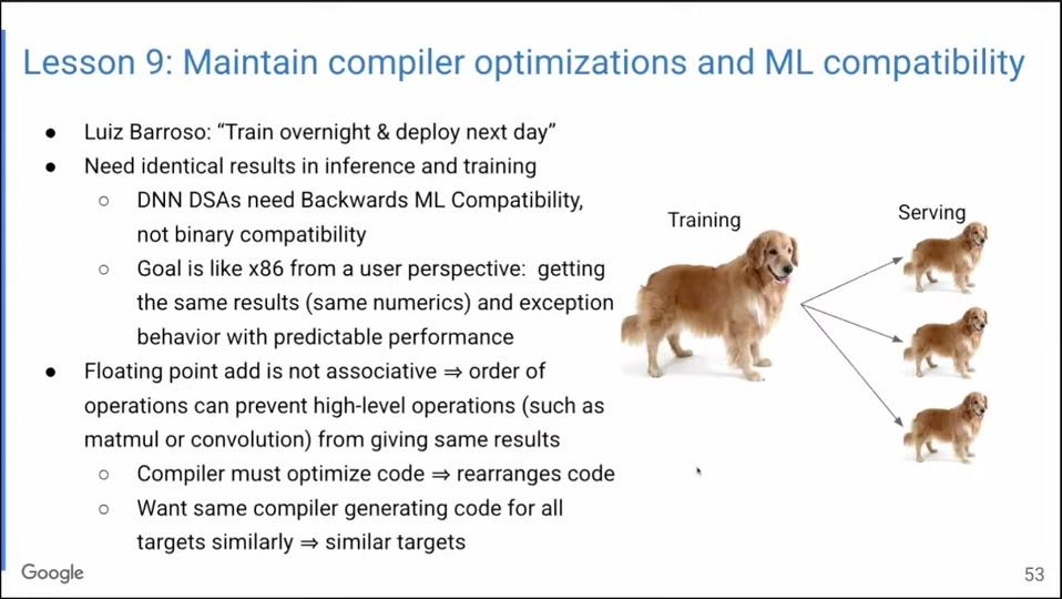 此外,编译器的后向ML兼容性非常重要。我的同事Luiz Barroso主管Google的一个与计算机架构无关的部门,他表示不希望在训练中花太多时间,希望一晚上就可以训练好模型,第二天可以直接部署。我们希望训练和推理时结果一致,这就是我们说的后向ML兼容性,我们还希望它能在所有TPU上运行,而不是每次更改TPU时都要重新训练。