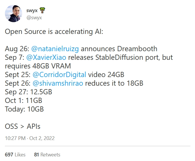如前所述,开源社区成功将Stable Diffusion和Dreambooth的所需内存最小化。