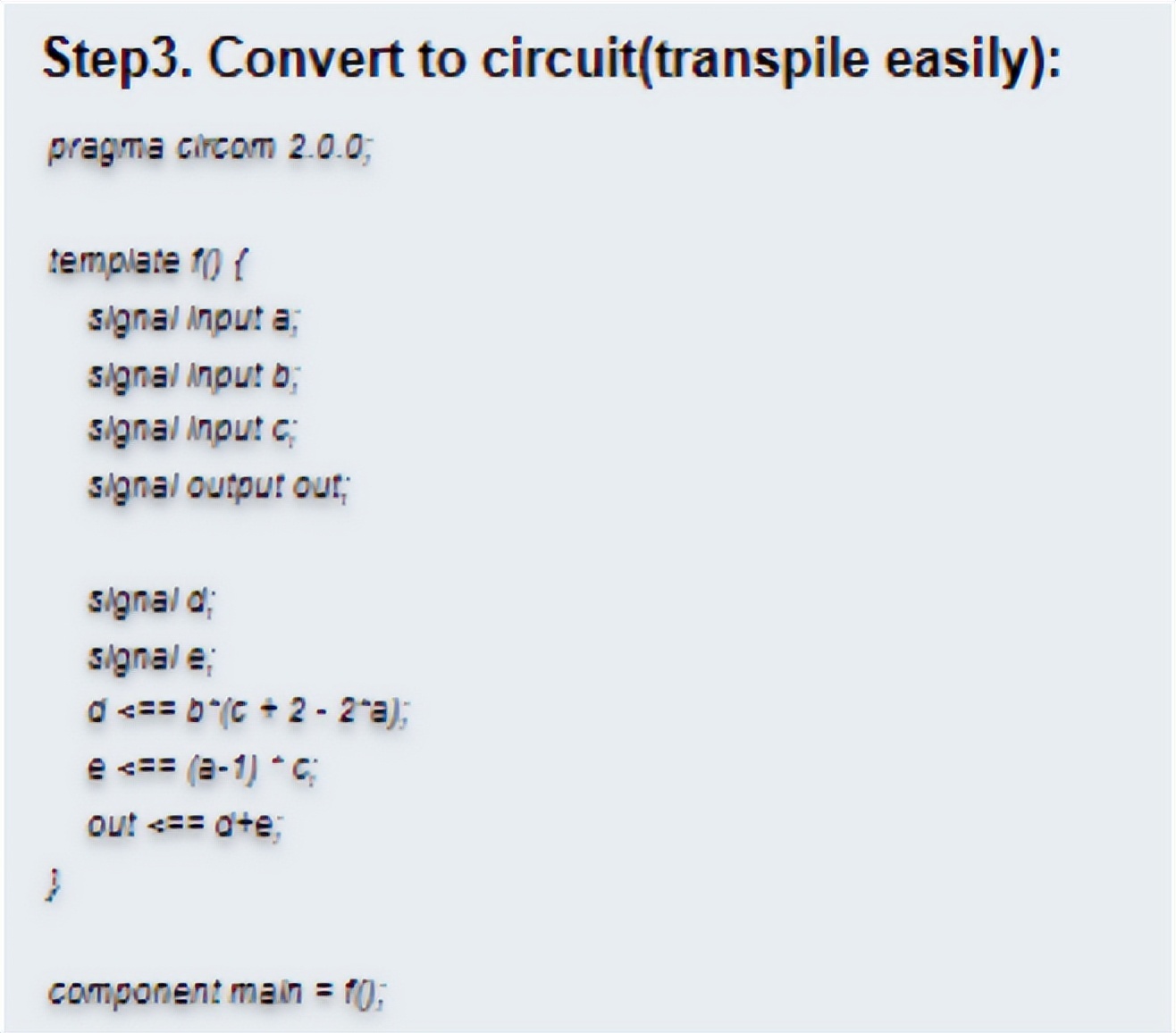将计算业务转化为统一的算术表达式,然后将算术表达式用Circom语言描述实现。