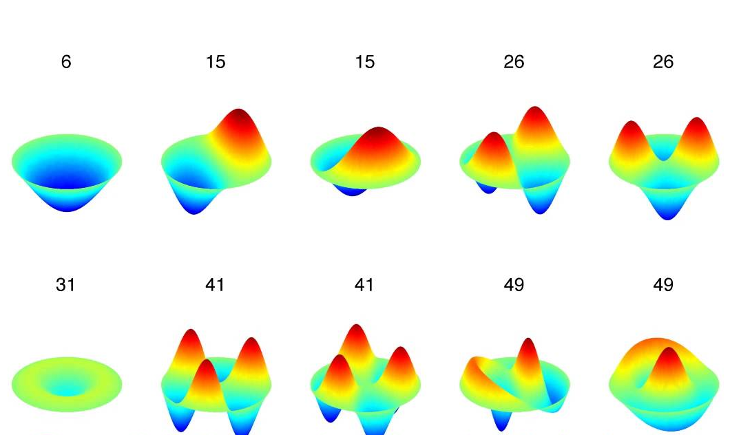 我要举例的第一个问题是关于声音和几何的关系。古希腊时代,人类就认识到声音由一些基本音组合而成。无论弹钢琴或是打鼓,敲击产生不同频率的波动,发出声音。波动由多个基本波组合而来,我们上音乐课时都知道基本音级 Do Re Mi Fa Sol。科学家对基本音级、基本波都很感兴趣。每个基本波有固定的频率,频率则由鼓的谱计算得到。波动产生很漂亮的图形,下面的图片显示了不同的波动,有高、有低,还有不动的地方。对于这样漂亮的几何,几何学家十分重视。