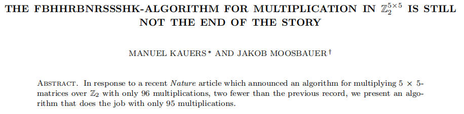 除了问有意义的问题之外,人工智能也没有办法知道它的算法是否最佳?事实上,来自奥地利林茨约翰·开普勒大学的研究人员考尔斯(Manuel Kauers)和穆斯鲍尔(Jakob Moosbauer)在其最新工作中表示,他们已经打破 AlphaTensor 的矩阵乘法记录。他们开发了一种以 95 步执行矩阵乘法的方法,比 AlphaTensor 的 96 步记录少了一步,此前的记录为 98 步。论文预印版于 10 月 13 日发布在 arXiv 上。
