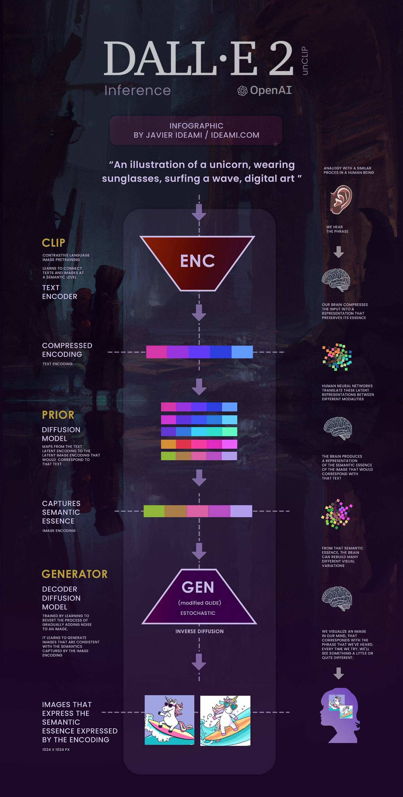 近日,Geniverse的联合创始人哈维尔·艾德米发文,从基本技术原理讲起,叙述了生成式人工智能的发展以及作者对该领域的理解。艾德米认为,大自然进化出一种机制来解决处理海量信息的机制:压缩和解压过程。我们的大脑能够获取通过感官到达的信息,并将其压缩成一种细节更少、抽象程度更高的形式。而在需要还原细节时,将压缩在隐藏空间的抽象特征还原出来。从DALLE-2 (OpenAI) 到Imagen (Google)、Stable Diffusion (Stability.ai) ,所有这些系统最初的共同基础是压缩和解压缩过程,它们允许在高细节和高抽象之间双向移动,即“扩散”。