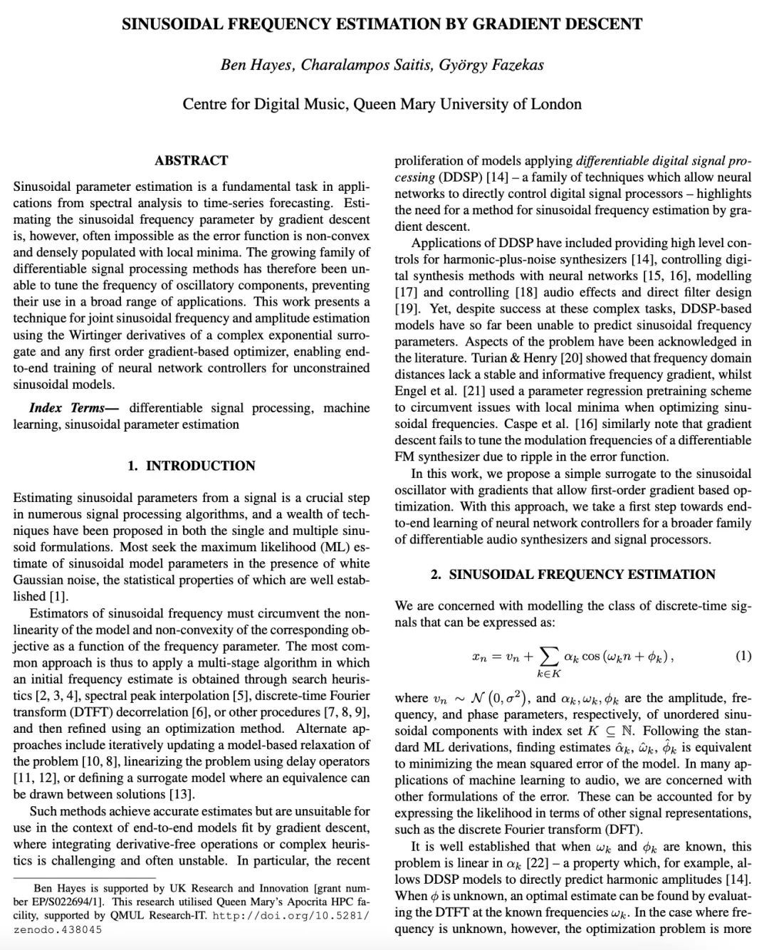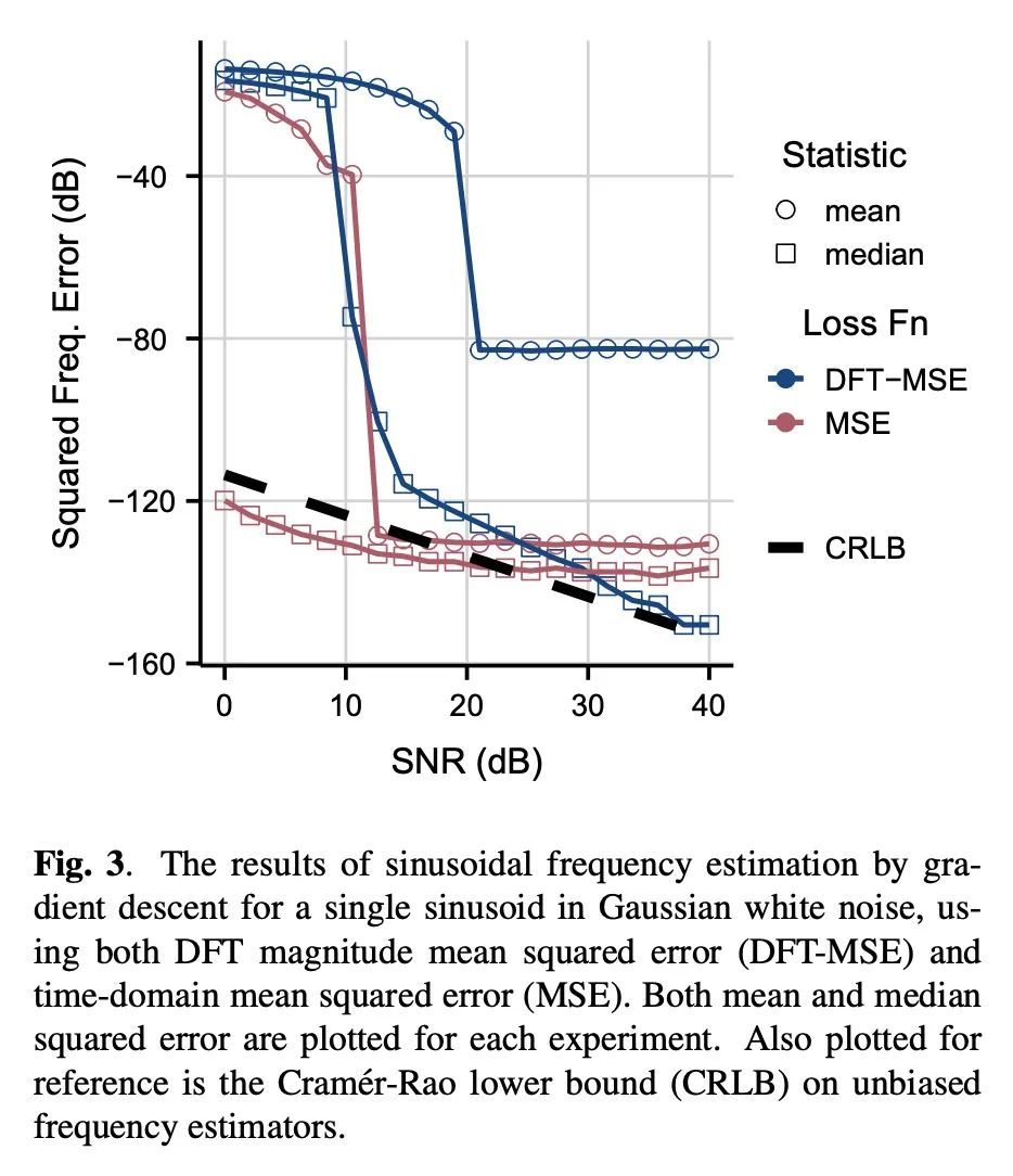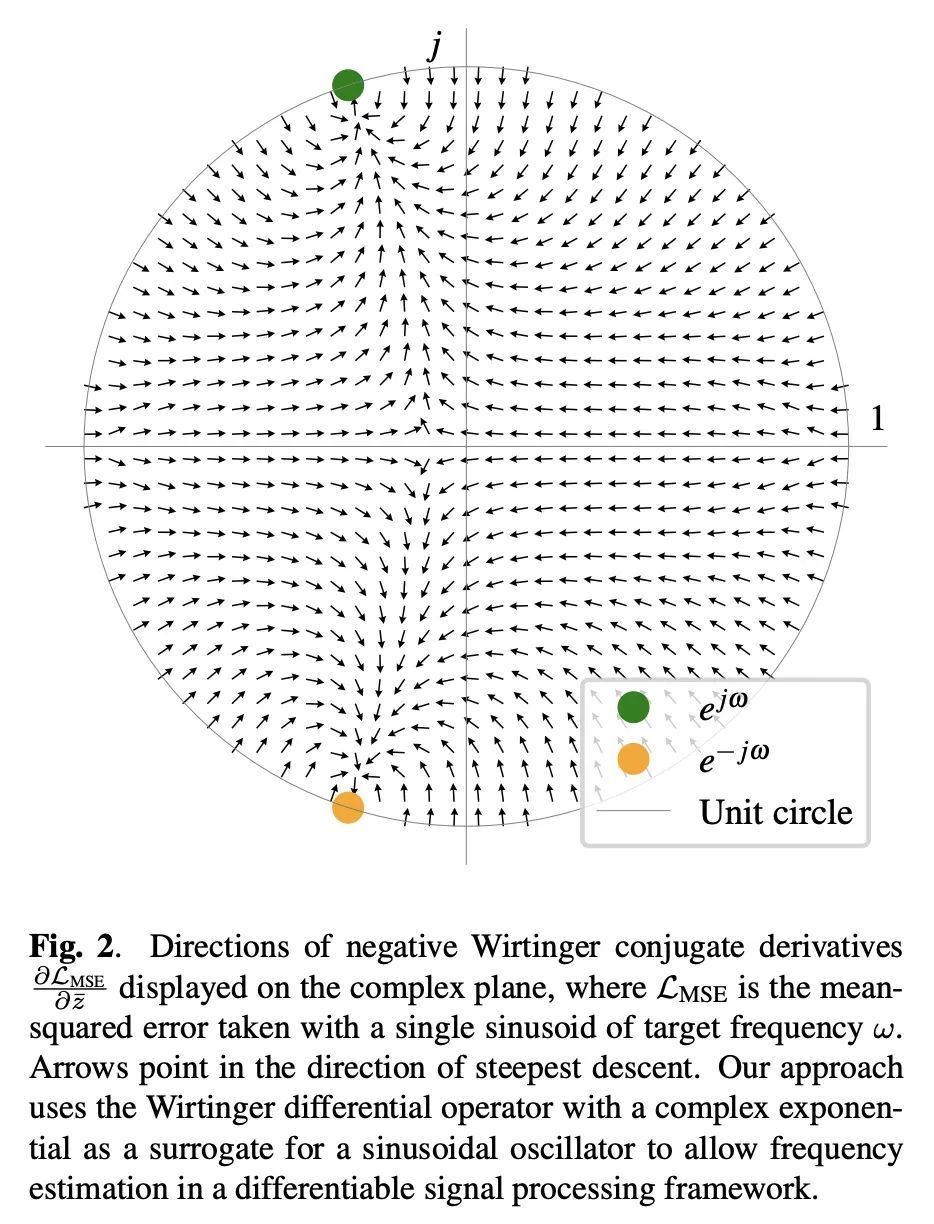 基于梯度下降的正弦波频率估计。正弦波参数估计是光谱分析和时间序列预测等应用中的一项基本任务。然而,通过梯度下降法估计正弦频率参数往往是不可能的,因为误差函数是非凸的,而且密布着局部极值。因此,越来越多的可微信号处理方法族一直无法调整振荡成分的频率,使其无法在广泛的应用中使用。本文提出一种用复杂指数代数的Wirtinger导数和任意基于一阶梯度的优化器进行正弦频率和振幅联合估计的技术,使无约束的正弦模型的神经网络控制器的端到端训练成为可能。