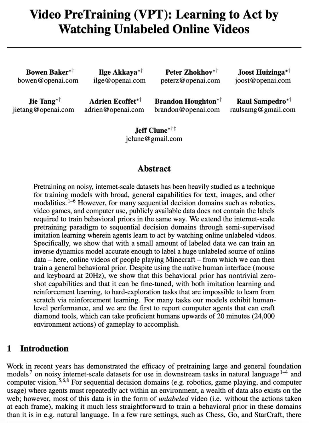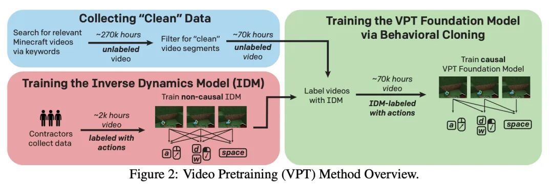 视频预训练(VPT):通过观看无标签在线视频进行顺序行动决策学习。在嘈杂的互联网规模数据集上进行预训练,作为一种训练模型的技术,对文本、图像和其他模态具有广泛而普遍的能力,已经被大量研究。然而,对于许多顺序决策领域,如机器人、视频游戏和计算机使用,公开可用的数据并不包含以同样方式训练行为先验的标签。本文通过半监督模仿学习将互联网规模的预训练范式扩展到顺序决策领域,智能体通过观看在线无标签视频来学习如何行动。通过少量的标记数据,可以训练出一个足够准确的逆动力学模型来标记巨大的未标记在线数据源——本文采用人们玩Minecraft的在线视频——然后可以从中训练出一般的行为先验。尽管使用的是原生的人工界面(鼠标和键盘,频率为20Hz),本文表明该行为先验具有非平凡的零样本能力,可以通过模仿学习和强化学习进行微调,以完成不可能通过强化学习从头学习的硬探索任务。对于许多任务,所提出的模型表现出人类水平的性能,本文首次报告了计算机智能体可以制作钻石工具,这可能需要熟练的人类在游戏中花费20分钟以上(24000个环境动作)才能完成。