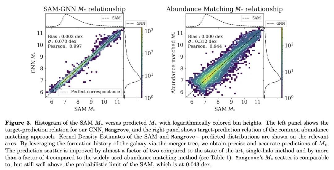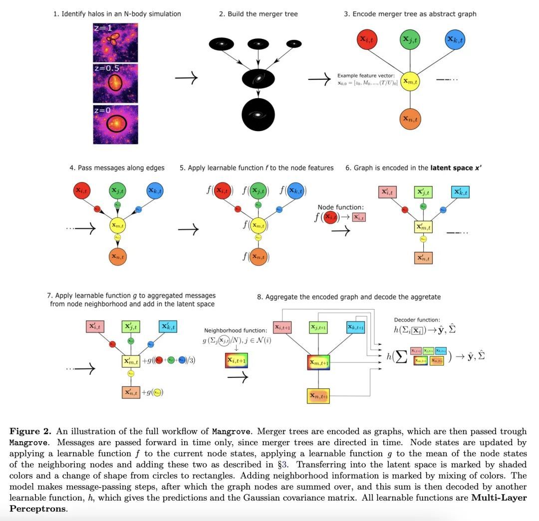 Mangrove:从合并树中学习星系属性。有效地将重子属性映射到暗物质是天体物理学的一个主要挑战。虽然半分析模型(SAM)和流体力学模拟在再现星系观测数据方面取得了令人印象深刻的进展,但这些方法仍然需要大量的计算时间,对许多应用来说是一个障碍。图神经网络(GNN)最近被证明是学习物理关系的自然选择。在天体物理学中发现的最内在的类似图的结构是暗物质合并树,它编码了暗物质光环的演变。本文提出一种新的、基于图的仿真框架𝙼𝚊𝚗𝚛𝚘𝚟𝚎,可以仿真银河系恒星质量、冷气体质量和金属度、瞬时和时间平均恒星形成率,以及黑洞质量——正如用SAM预测的那样——在一个(75Mpc/h)³的模拟盒中,平均根误差比其他方法低2倍,只需40秒,比SAM快4个数量级。𝙼𝚊𝚗𝚐𝚛𝚘𝚟𝚎可以量化星系特性对合并历史的依赖。将以上结果与该领域的现有技术水平进行了比较,并显示出所有目标属性的明显改进。