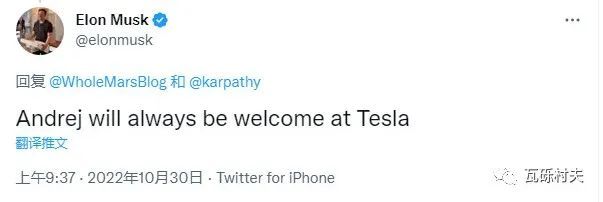 访谈中,Andrej表达了将来可能重回特斯拉的想法。对此,老马在推上火速回复:特斯拉永远欢迎Andrej