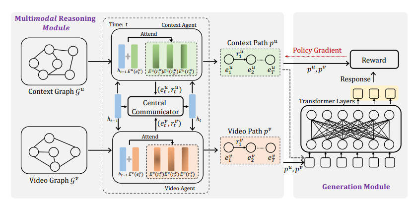 【推荐理由】此研究基于视频的对话生成,其中基于对话上下文和相关视频生成响应。这项任务的主要挑战在于 (1) 将视频数据集成到预训练语言模型 (PLM) 中的难度,这给利用大规模预训练的力量带来了障碍;(2) 在整个推理过程中考虑各种方式的互补性的必要性。尽管在基于视频的对话生成方面取得了显着进展,但在以允许来自不同模式的信息相互补充的方式与 PLM 集成时,现有方法仍然存在不足。为了缓解这些问题,此研究首先建议从视频中提取相关信息,并将其转化为 PLM 可接受的推理路径。此外,本文提出了一种多智能体强化学习方法,以协作对不同模式(即视频和对话上下文)进行推理。在两个公共数据集上的实证实验表明,本文所提出的模型在自动和人工评估方面都大大优于最先进的模型。