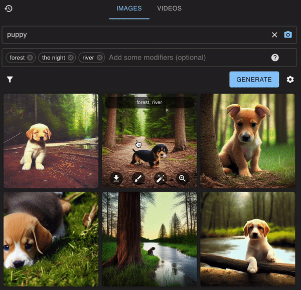 比如说咱现在输入一个提示词:小狗,修饰词可以设置为:森林、河边、夜晚。